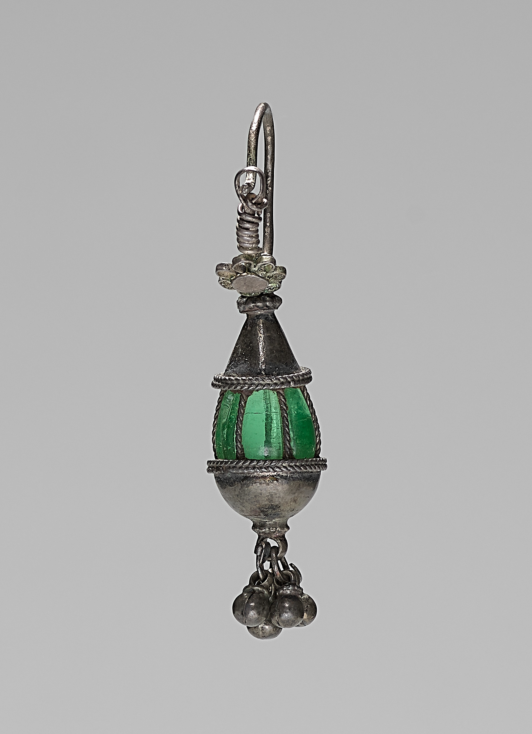 Green and silver earring, titled "Earring" by unknown artist. The earring features a large green bead encased in a metal framework. The green bead is oval-shaped and has a smooth surface. It is positioned in the center of the earring. The metal framework is primarily silver in color. The framework has a twisted rope-like design around the green bead. A smaller, similarly designed piece of metal is positioned above the green bead. The top of the earring features a long, thin hook. A small loop and coiled wire are at the top of the hook. A tassel-like element consisting of four small balls hangs from the bottom of the earring. The background of the image is gray.