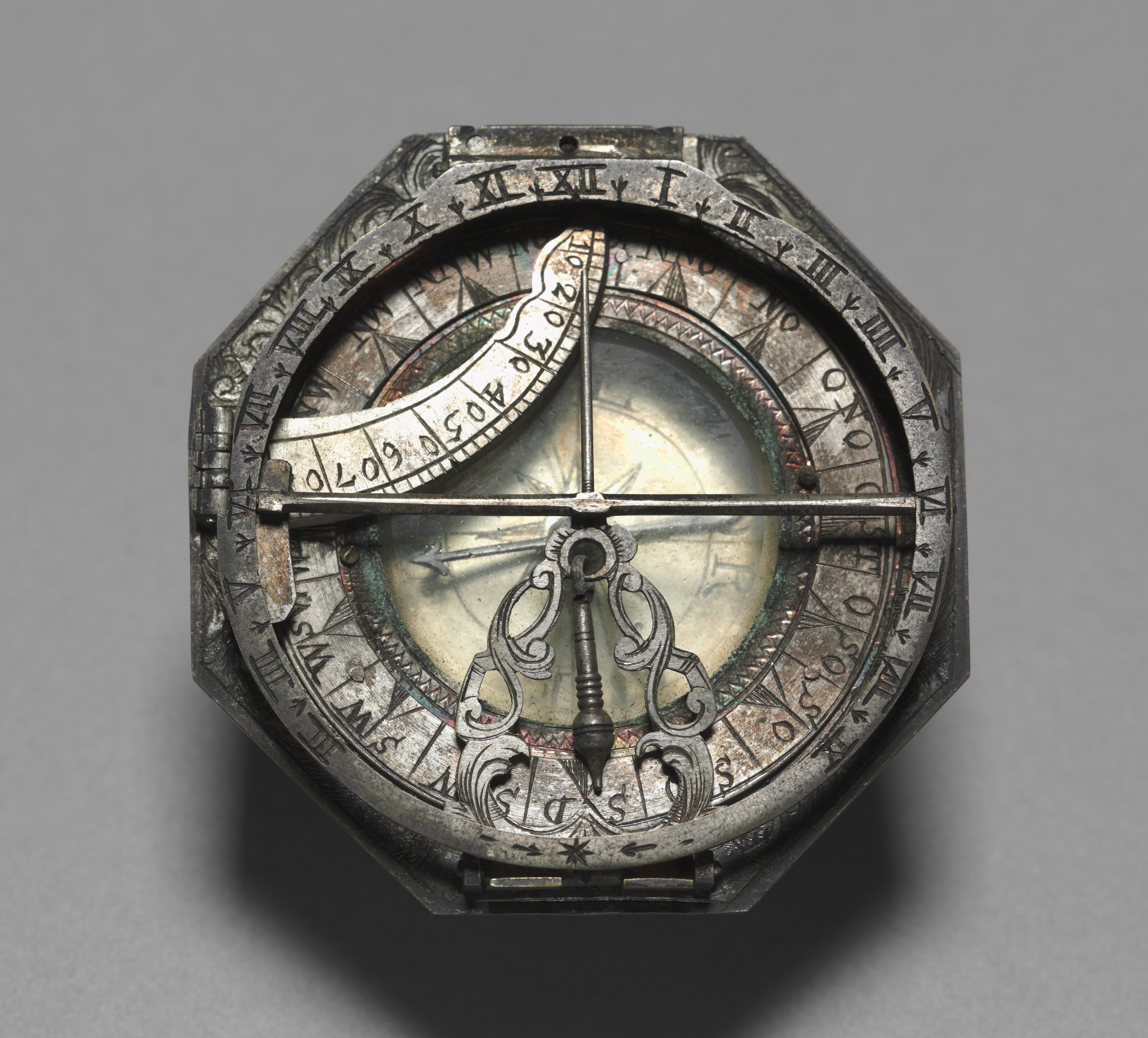 Octagonal compass with sundial; silver, engraved. A dial on the top left; the bottom center with a filigree ornament; a compass dial underneath; and a ring marked with Roman numerals. The compass has a dark patina. The outer edge of the compass is engraved with letters and symbols. The bottom center of the compass has a filigree ornament. The sundial has lines and numbers on it. The background is gray. The title is "Compass and Sun Dial", by artist Erasmus.
