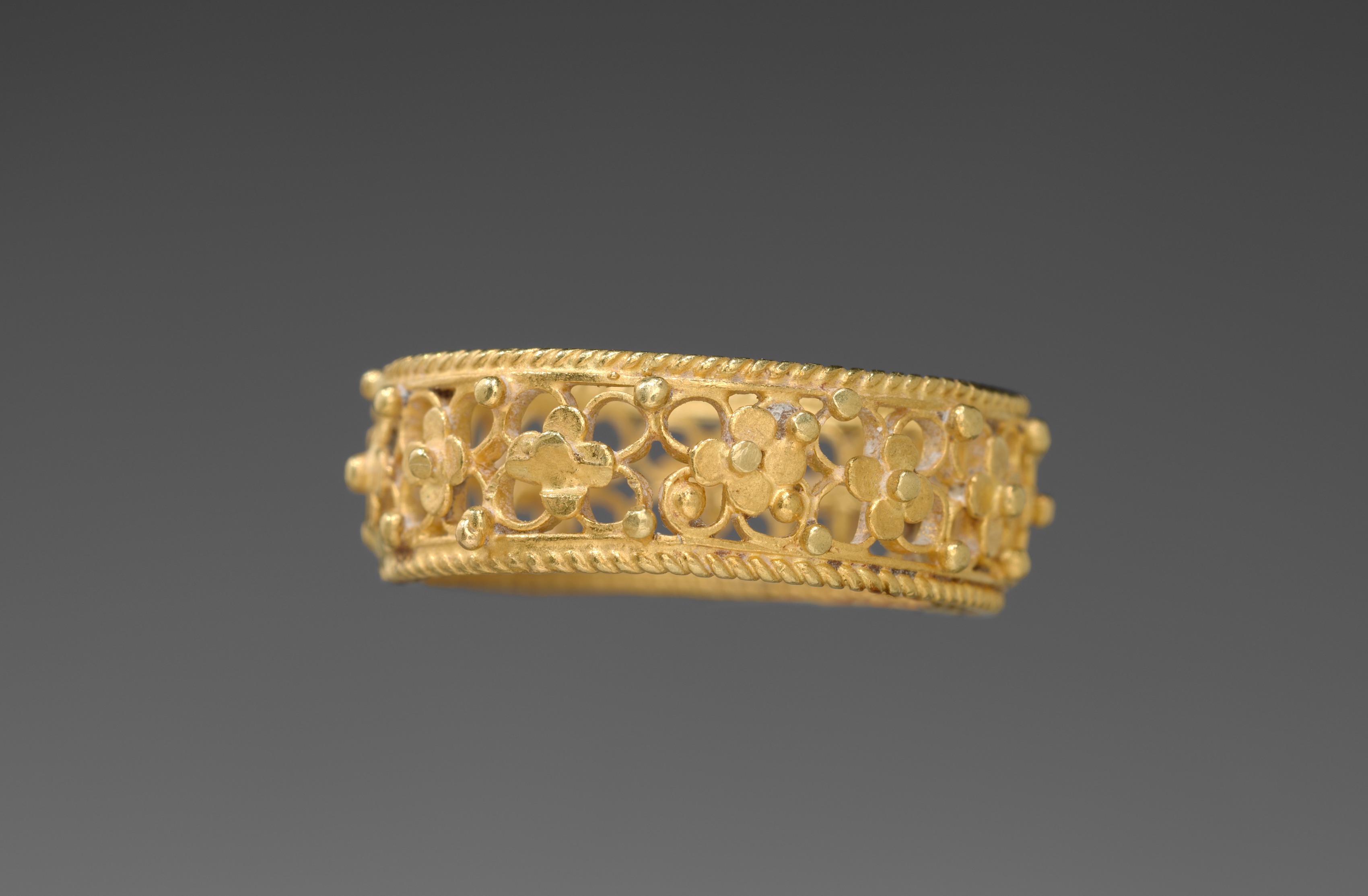 Golden ring with a wide band. The band has a rope-like texture on the top and bottom edges. The main body of the band features an openwork design with a repeating pattern of four-petaled flowers and small spheres. The background is dark gray. Title: Ring Artist: Unknown