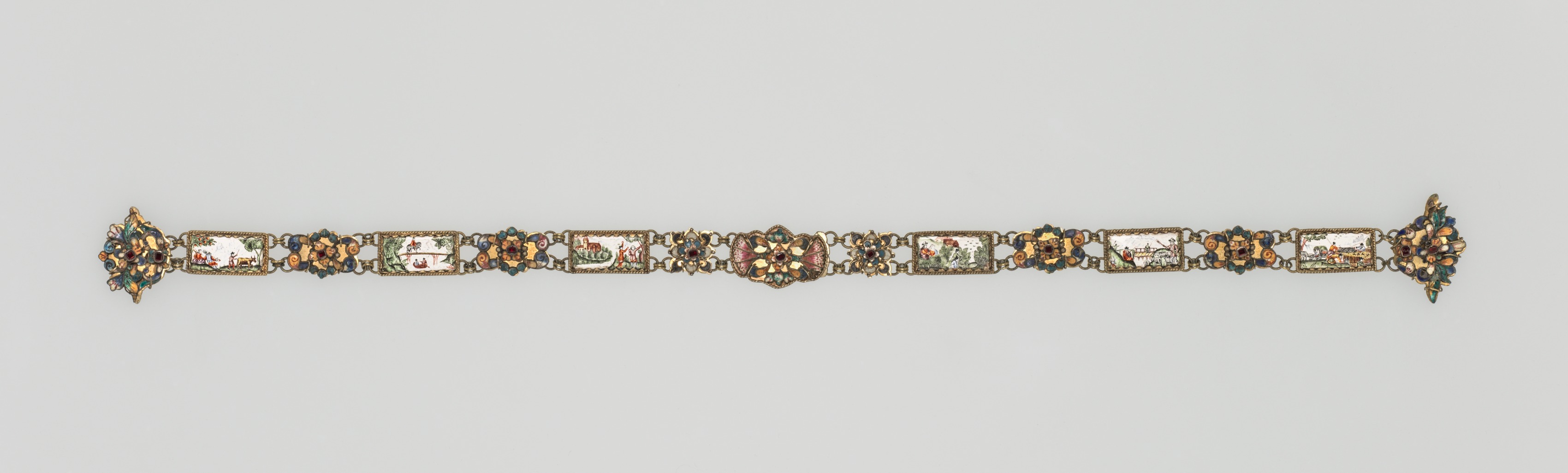 The belt by Alexander Calder features a gold-tone metal base. The belt consists of rectangular links and ornate floral-shaped links that alternate. The rectangular links have white backgrounds with colorful floral designs. The floral-shaped links have colorful stone and enamel inlays. The stones and inlays are shades of pink, blue, orange, green, and white. The belt has a symmetrical design with mirrored ends. The background of the image is light gray.