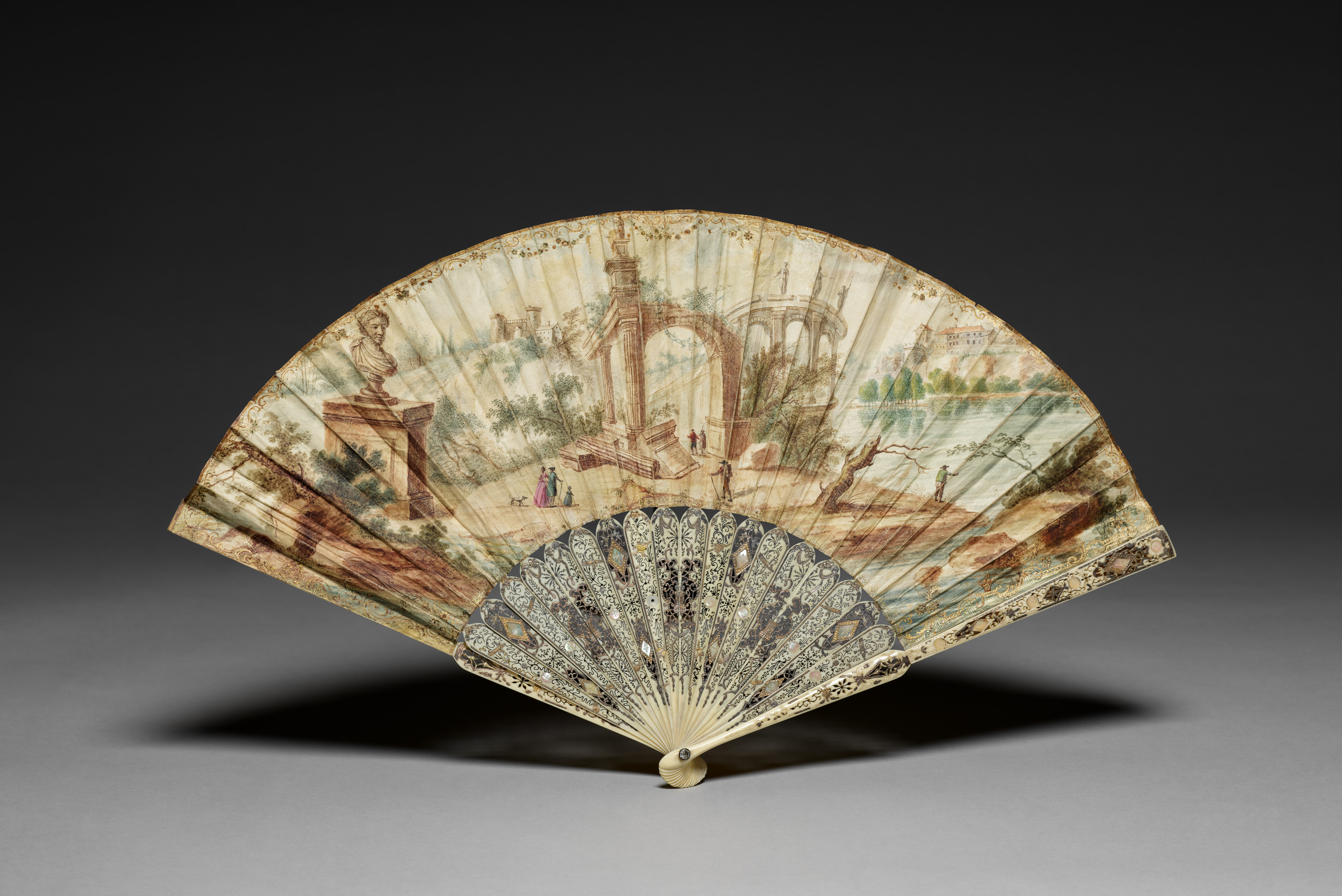 A folding fan with a landscape scene on it. The fan is open and facing forward. The top half shows a colored illustration depicting a scenic view with trees, ruins, people standing on steps with a bridge to the right spanning a body of water, and a figure on the left. The bottom half near the handle has an etched design on a white background. The fan's ribs and handle are beige. The background of the fan image is black to gray gradient.