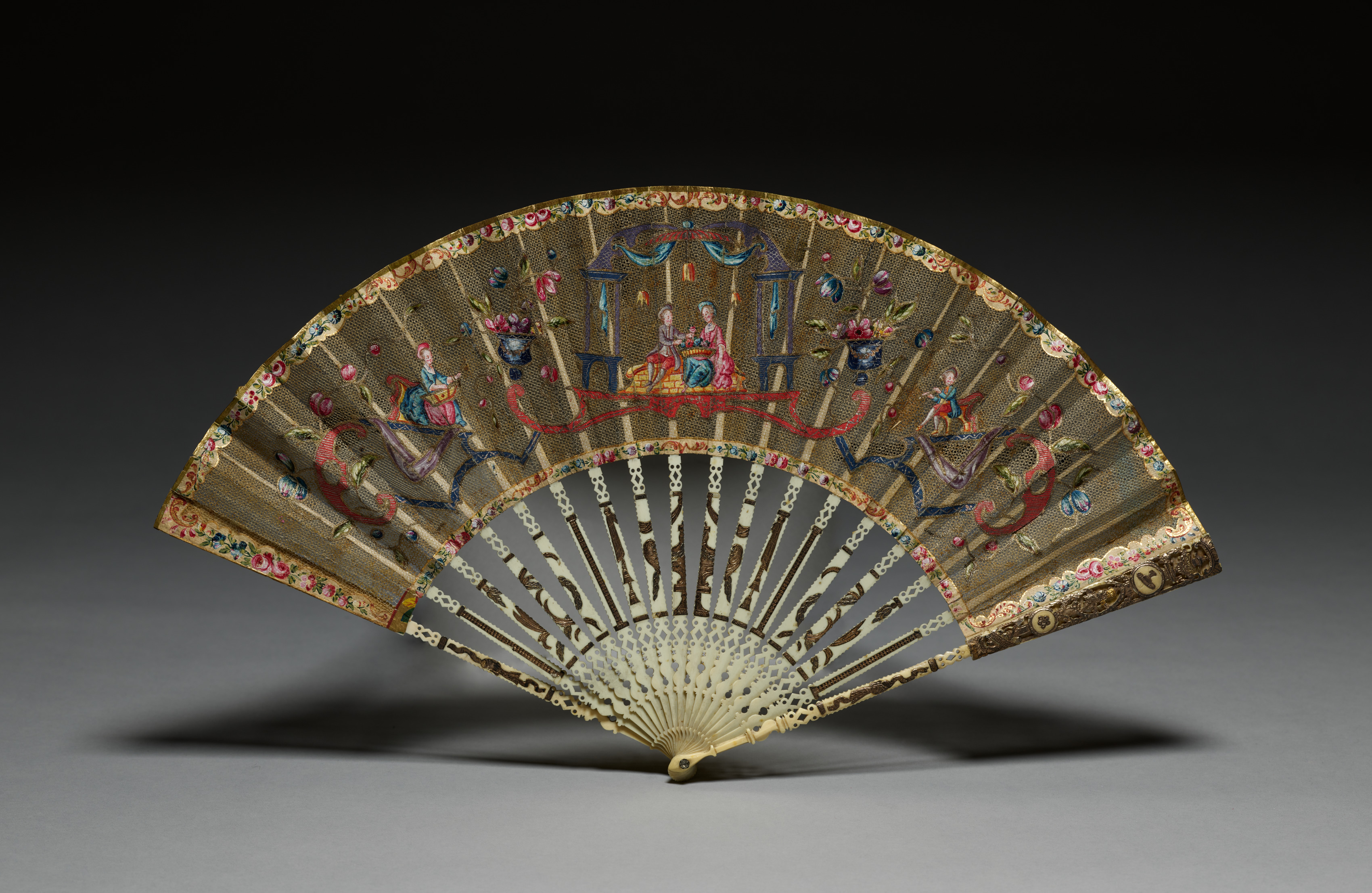 Folding fan with decorated semi-circular head, short cylindrical handle. The head has thirty-two ribs, twenty-four of which have white interstices; semi-circular latticework on the bottom third; the top two-thirds have brown fabric with applied polychrome ornaments; the border has flowers and curvilinear motifs; the ribs are joined at the top by a guard with a scroll design; the fabric on the reverse side is gold; the guard and rivet are ivory; the handle has ten segments with floral scrolls. Ornamental appliqué figures and ornaments. The fan depicts four women; one woman wears a blue dress; one wears a pink dress; one sits on a low platform; one sits beside a blue and pink pavilion; there are also pink, blue, and white flowers; a teapot and teacup; furniture; a blue and white vase; and a covered pot.