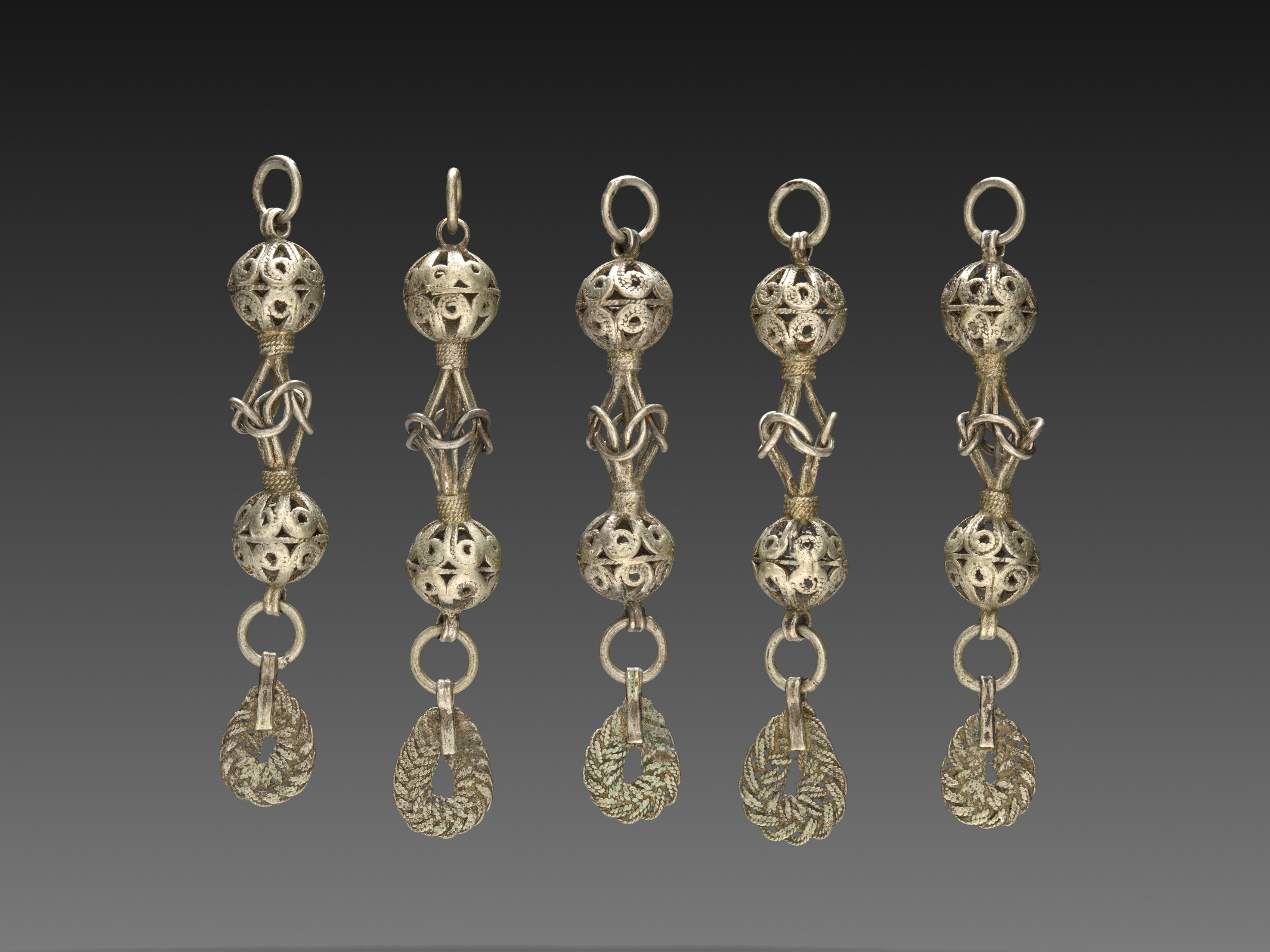 Set of Buttons by artist. Five gold-colored metal buttons with loop fastenings. Each button consists of a small spherical top with a loop attached; the top sphere of each has a textured surface with four rounded indentations on either side and a textured rope effect below. A twisted metal piece protrudes from the bottom; it then loops back on itself on either side and fastens to a second sphere below, which is similar to the top but slightly smaller. Below the second sphere is a single ring attached to a teardrop-shaped pendant with a leaf pattern. The background is dark grey at the top; it fades to light grey at the bottom.