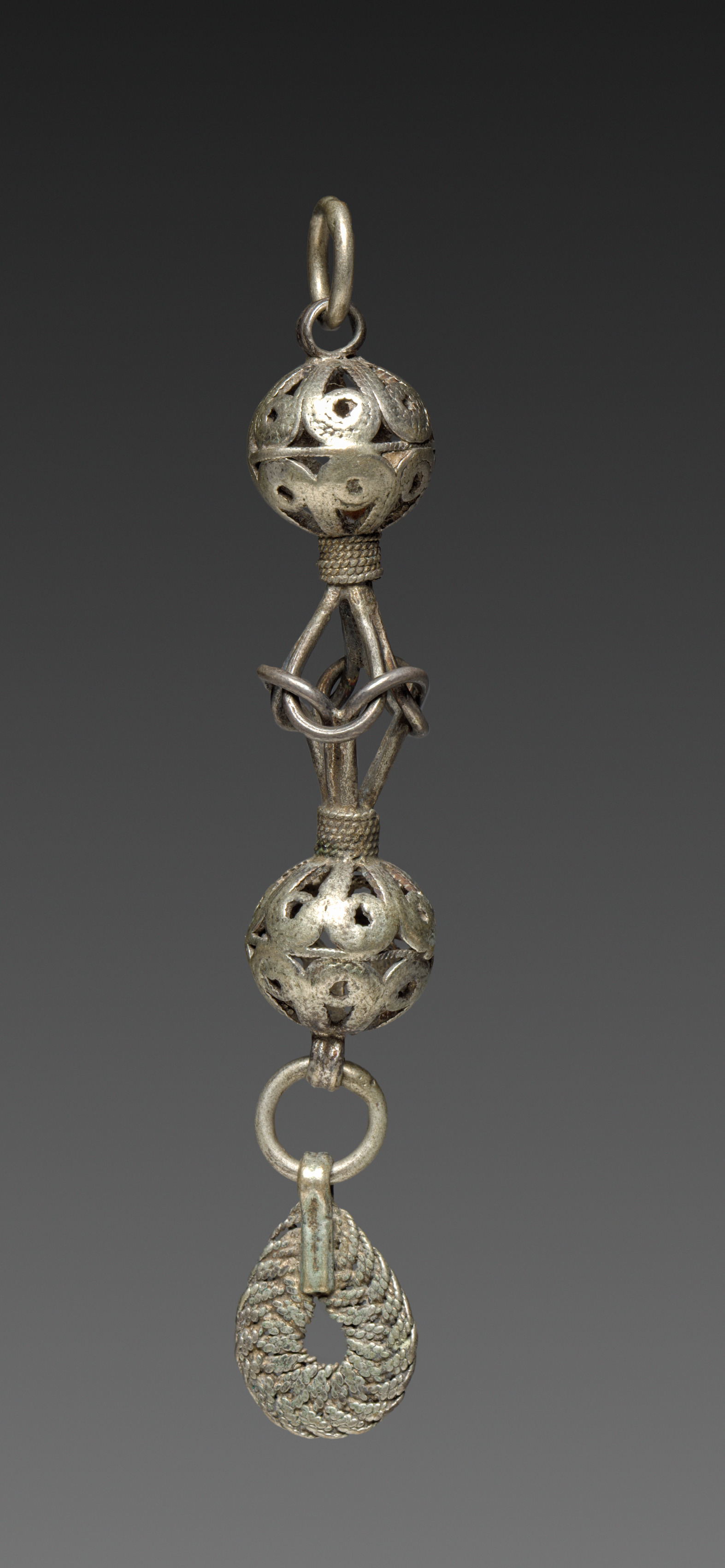 Metal object with a loop at the top. Two hollow metal balls with decorative holes are stacked on top of each other. A twisted metal piece connects the balls. A ring connects the bottom ball to a metal piece shaped like a partial circle with a textured surface. The background fades from dark gray at the top to light gray at the bottom. The object is by artist "Button".
