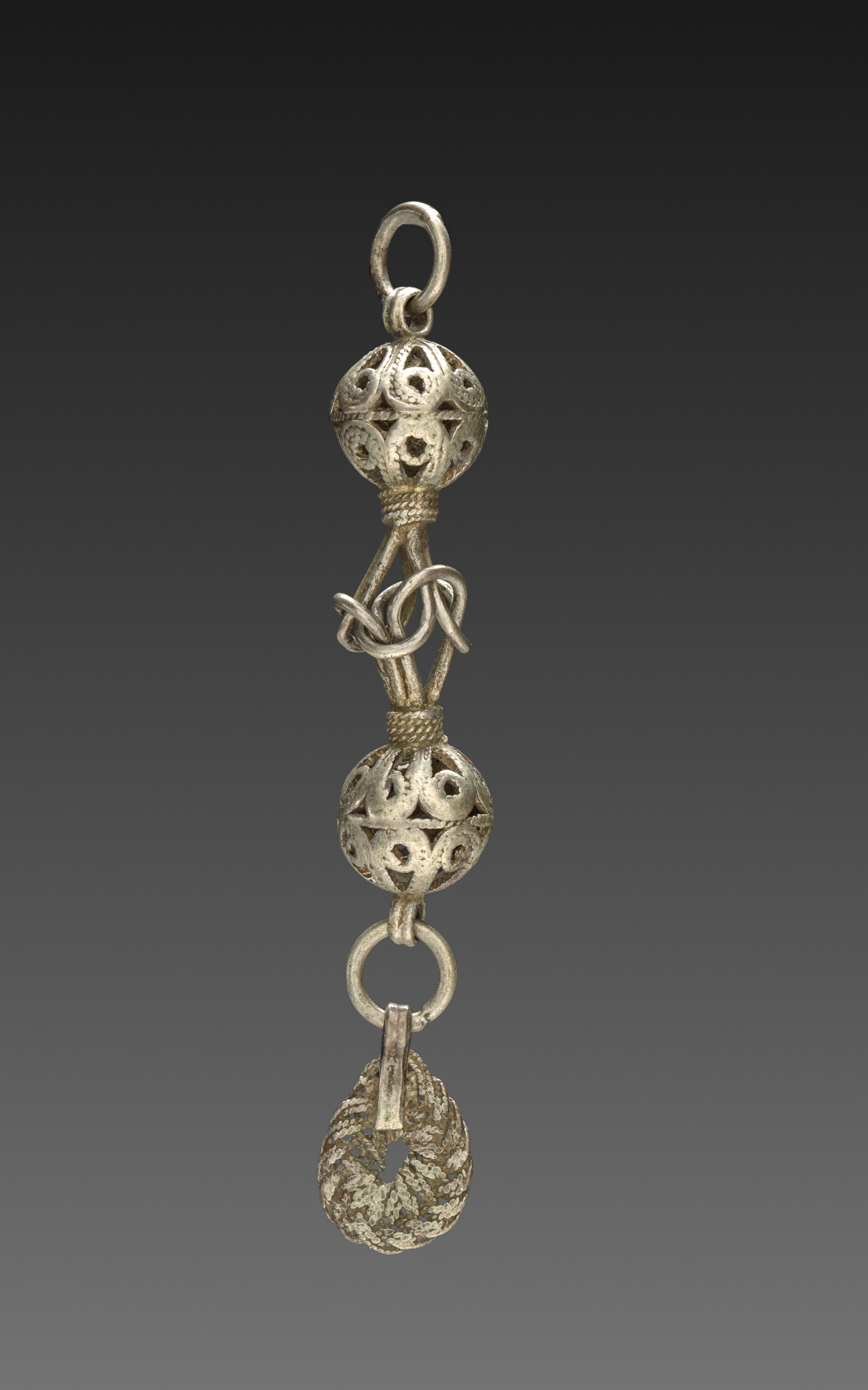 Metallic object with a loop at the top, two perforated spherical components in the middle, and a teardrop-shaped component at the bottom, on a gray gradient background; Button; artist not identified.