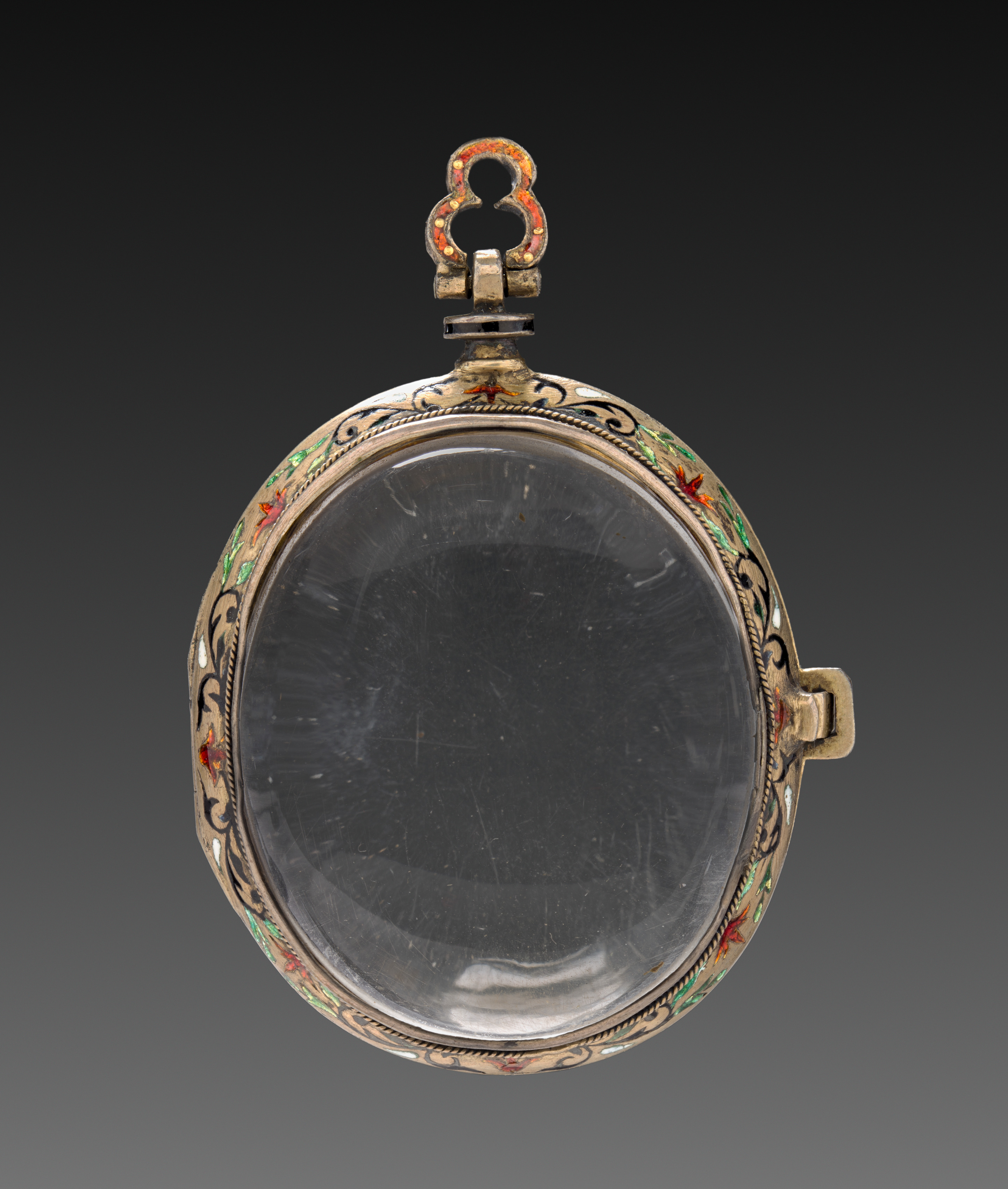 Round, open watch case with clear glass face cover. The case has a key-shaped loop at the top. The case body features an etched, curvy black design with colorful enamel details. The background is gray to black gradient. Title: Watch Case. Artist unknown.