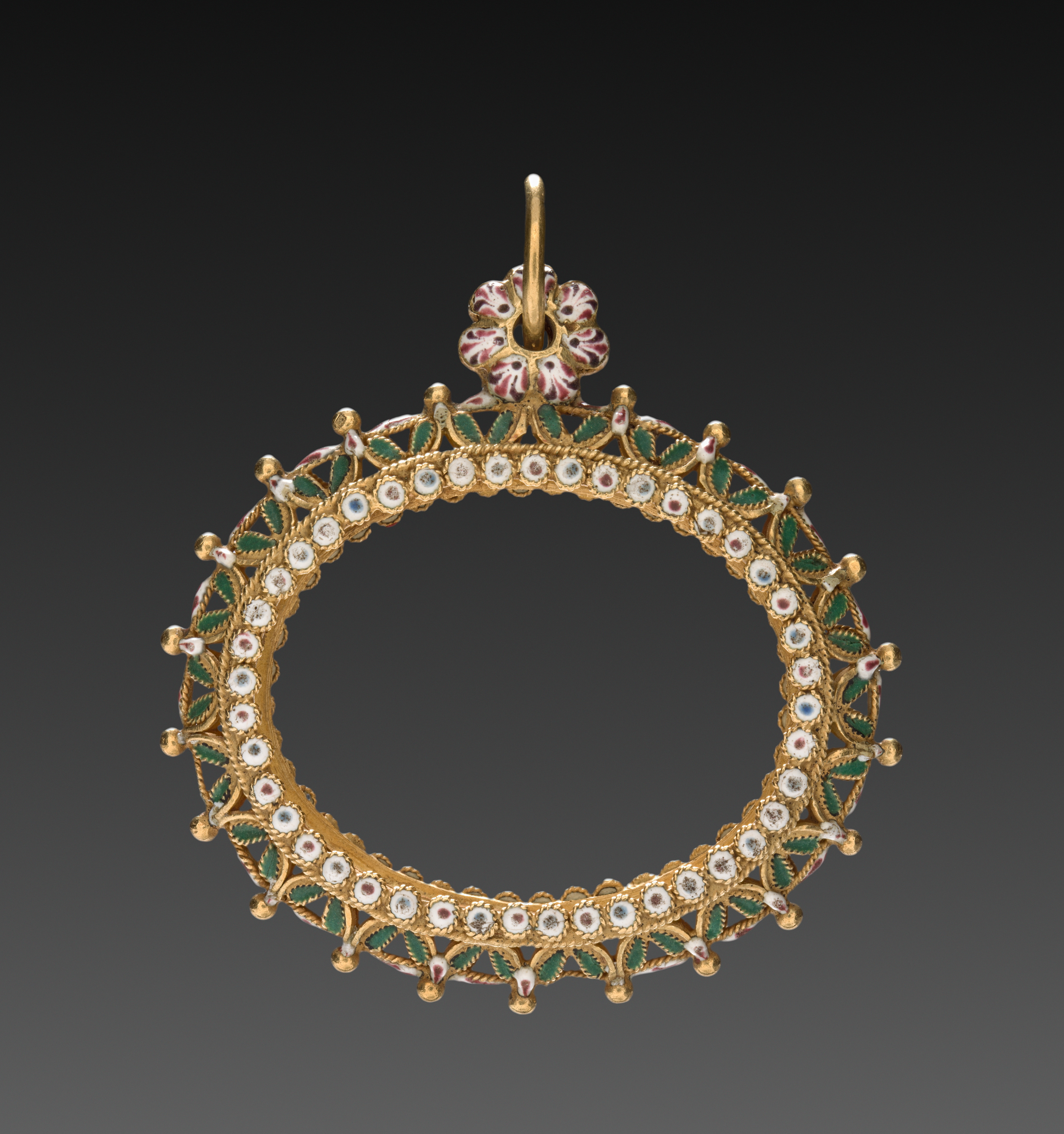 Gold pendant in the shape of a circle, with a gold loop at the top for fastening. The top of the loop is decorated with red and white details. The pendant features a repeating pattern of green and white details around its perimeter. The green details are leaf-shaped. The white details are round and resemble gems. Small gold balls are positioned between each detail. The background of the image is dark gray, transitioning to black.