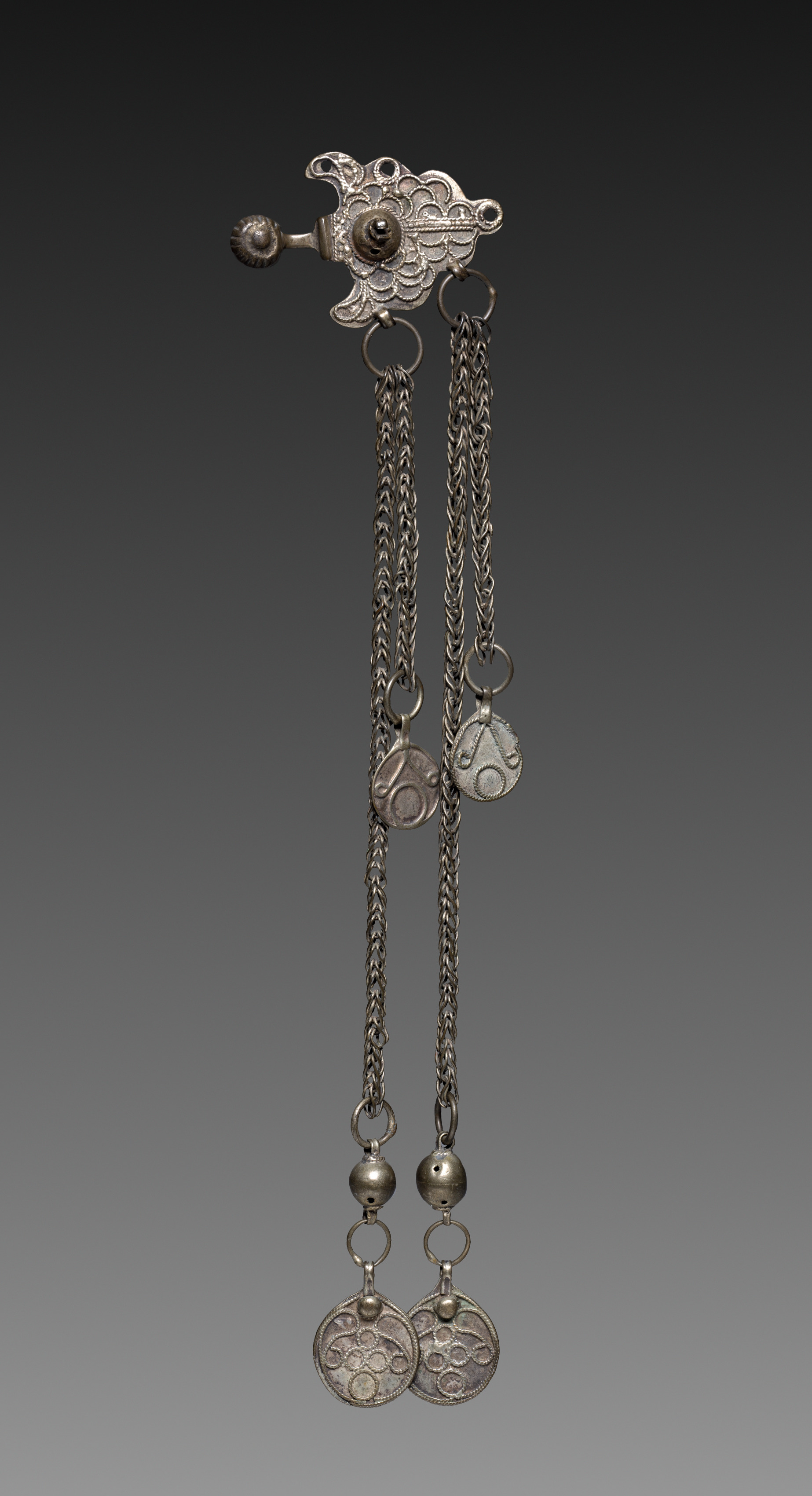 Metal brooch with a pin on the left side and a decorative top; three long metal chains hanging down, each with a small circle near the top, then a larger disk; two chains end in smaller metal balls and larger disks, while one chain ends in a smaller disk.