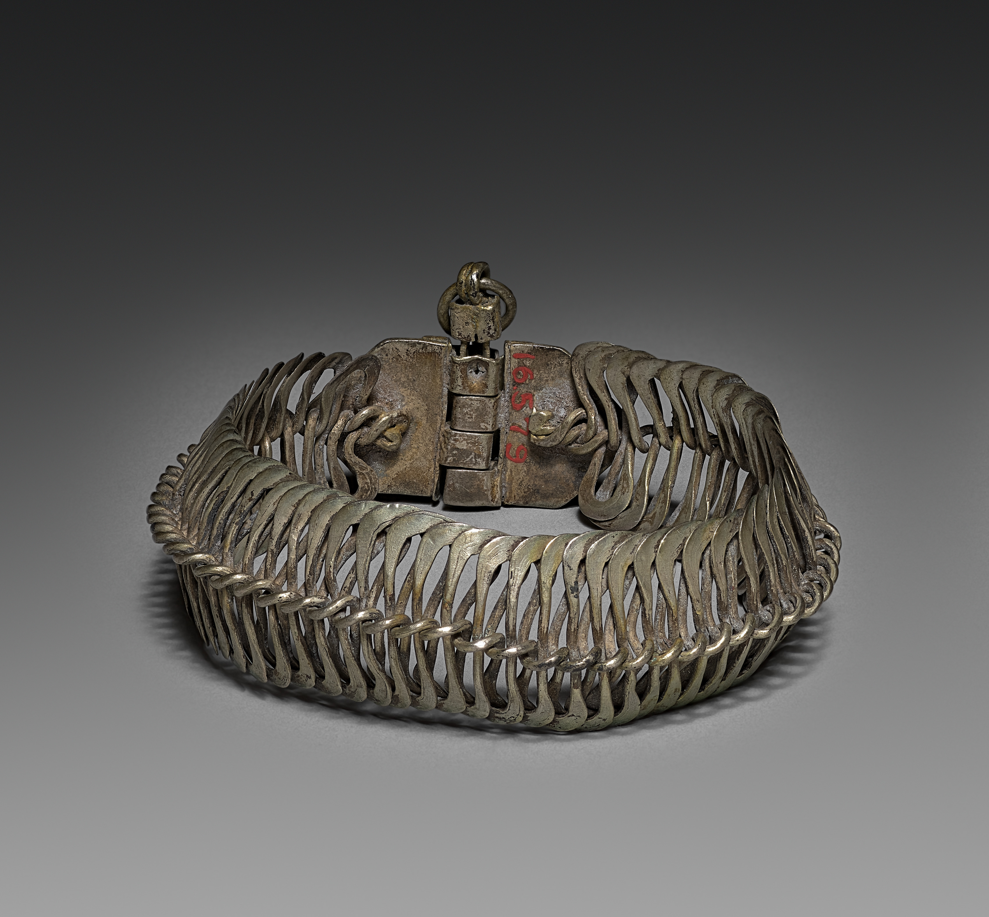 Metal bracelet with a clasp. The bracelet is made of metal and has a clasp at the top. The bracelet is made up of many thin, curved strips of metal that are woven together. The clasp is made of thicker metal and has a small loop at the top. The clasp has red writing on it. The background is gray. The bracelet is titled "Bracelet" and is by an unknown artist.