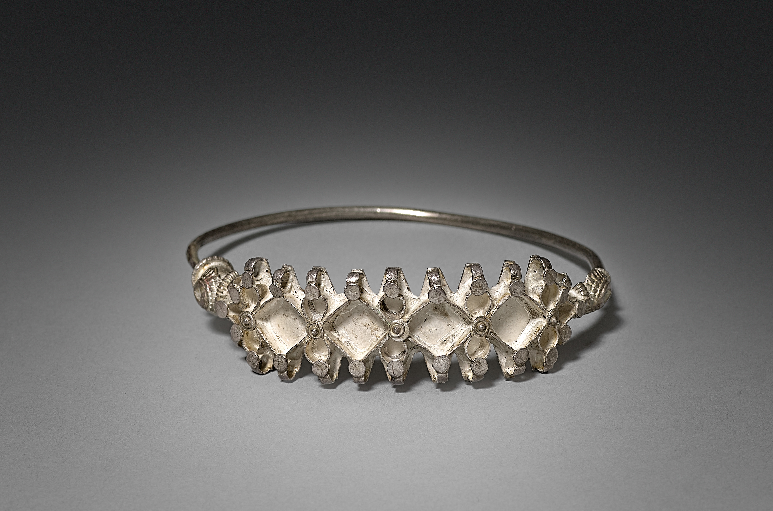 Silver nose ring with a round band, featuring a central row of 8 protruding diamond and square-shaped motifs with rounded corners, separated by small circular details; a small circular detail on the left end; on a gray gradient background. "Nose Ring" by unknown artist.