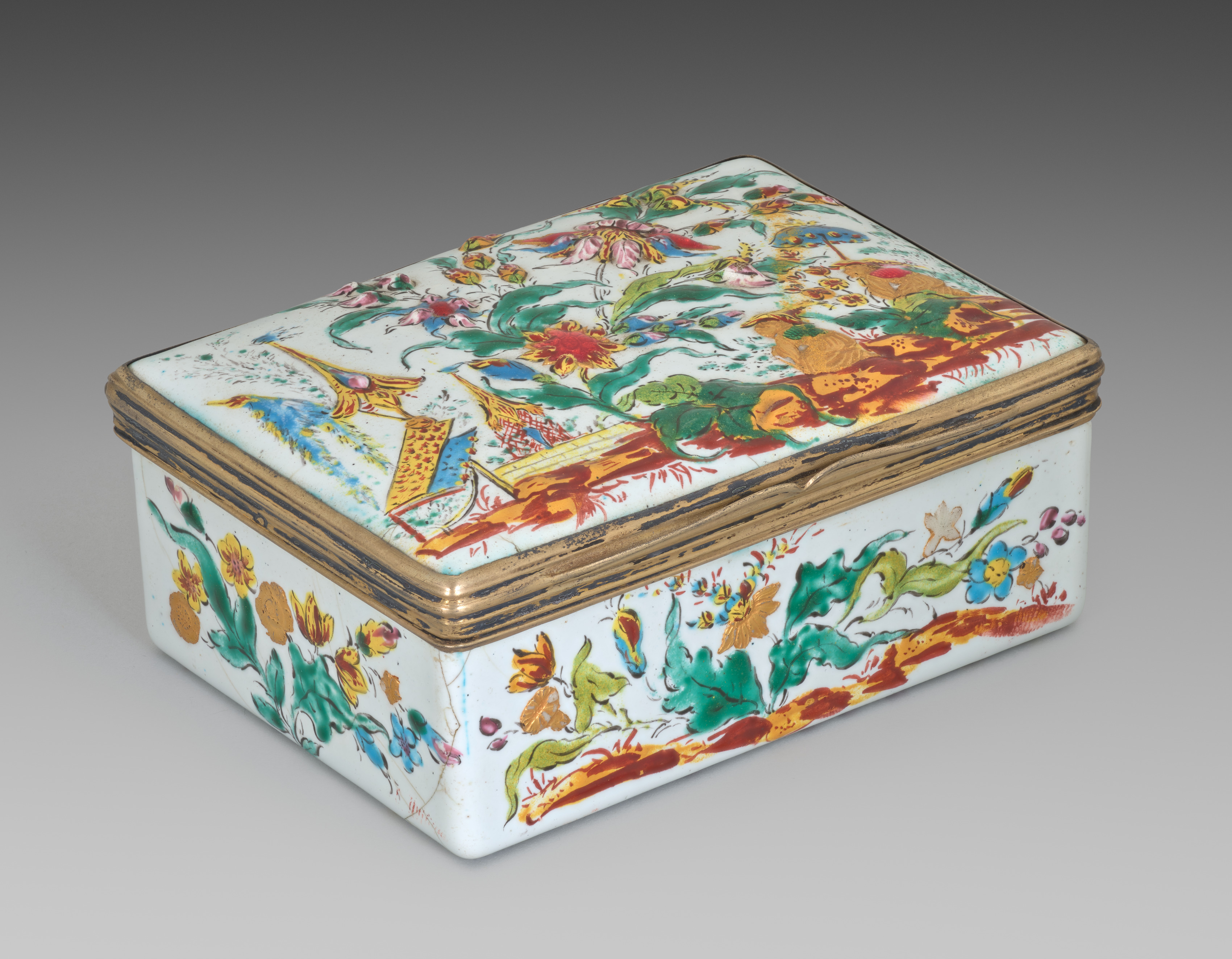 White rectangular box with a lid; gold trim around edges; colorful floral designs on lid and sides, including blue, green, yellow, orange, and red; background gray gradient. Box by artist.