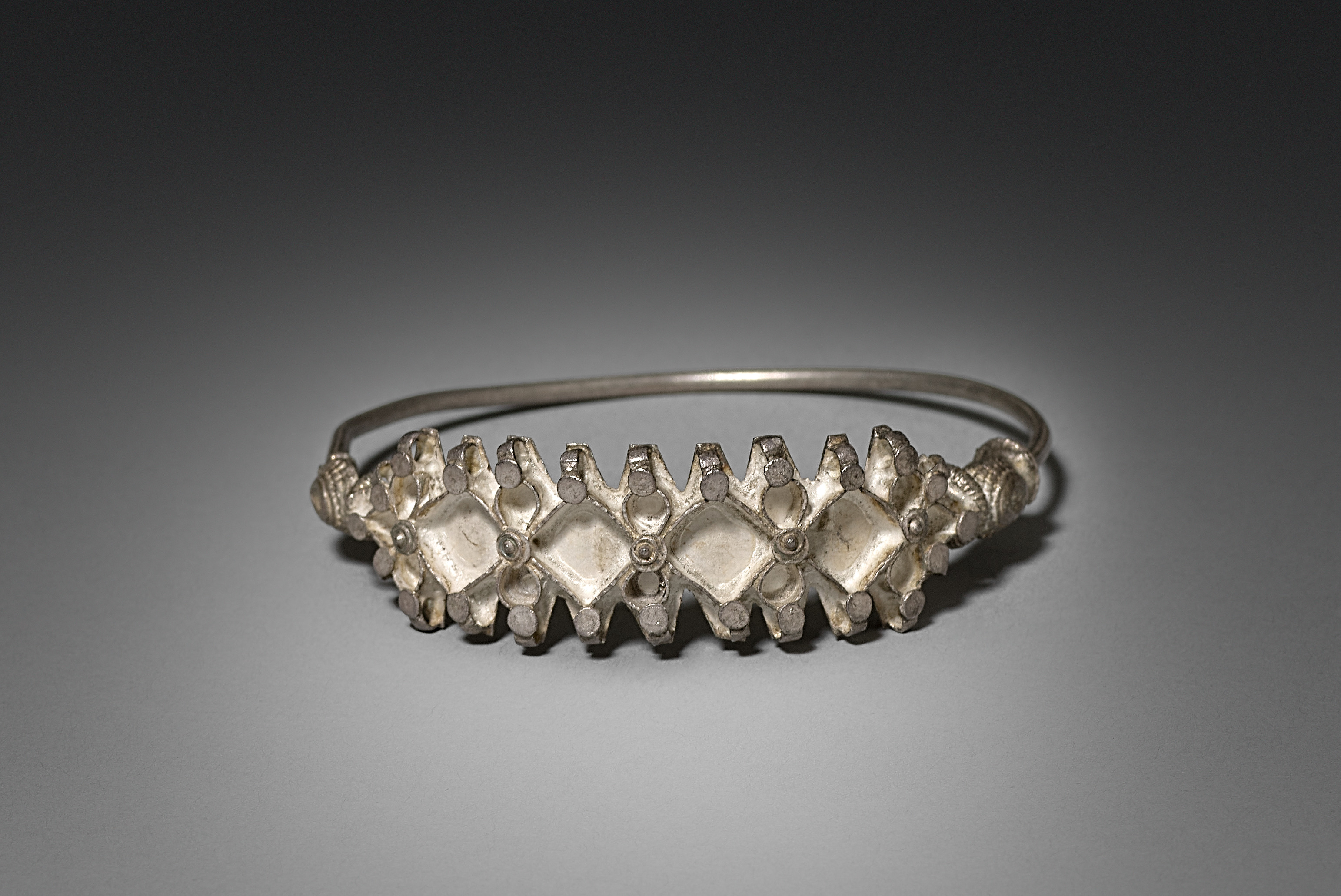 Silver nose ring with a thin band and a decorative front section; the front section consists of a repeating diamond shaped pattern with a small circle in the center of each diamond; the edges of the diamonds are adorned with small spikes.