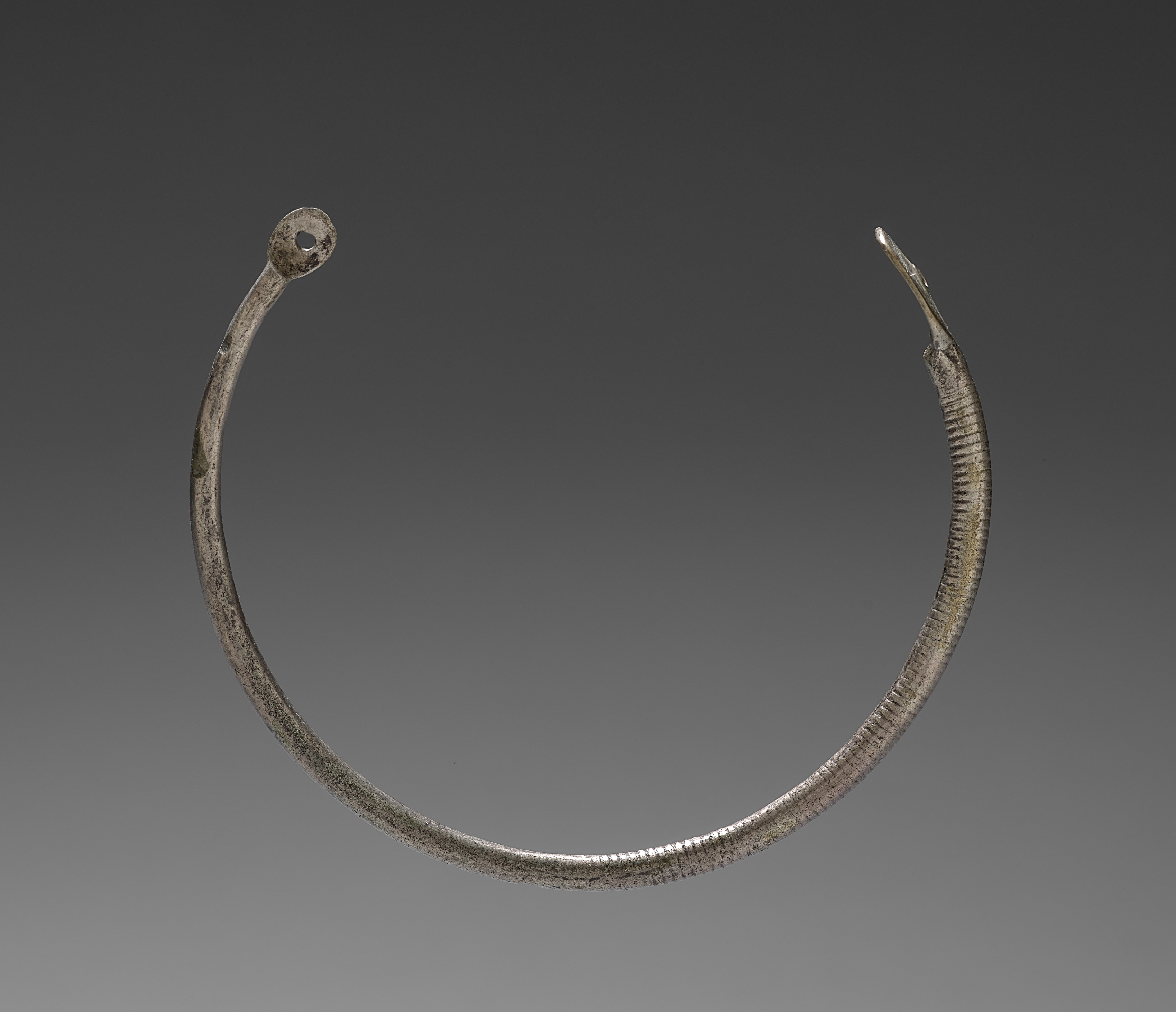 Metal nose ring, thick and rounded, with one end featuring a small circular hole and the other end sharp and jagged; surface appears weathered and textured; presented against a gradient gray background; by artist titled "Nose Ring".