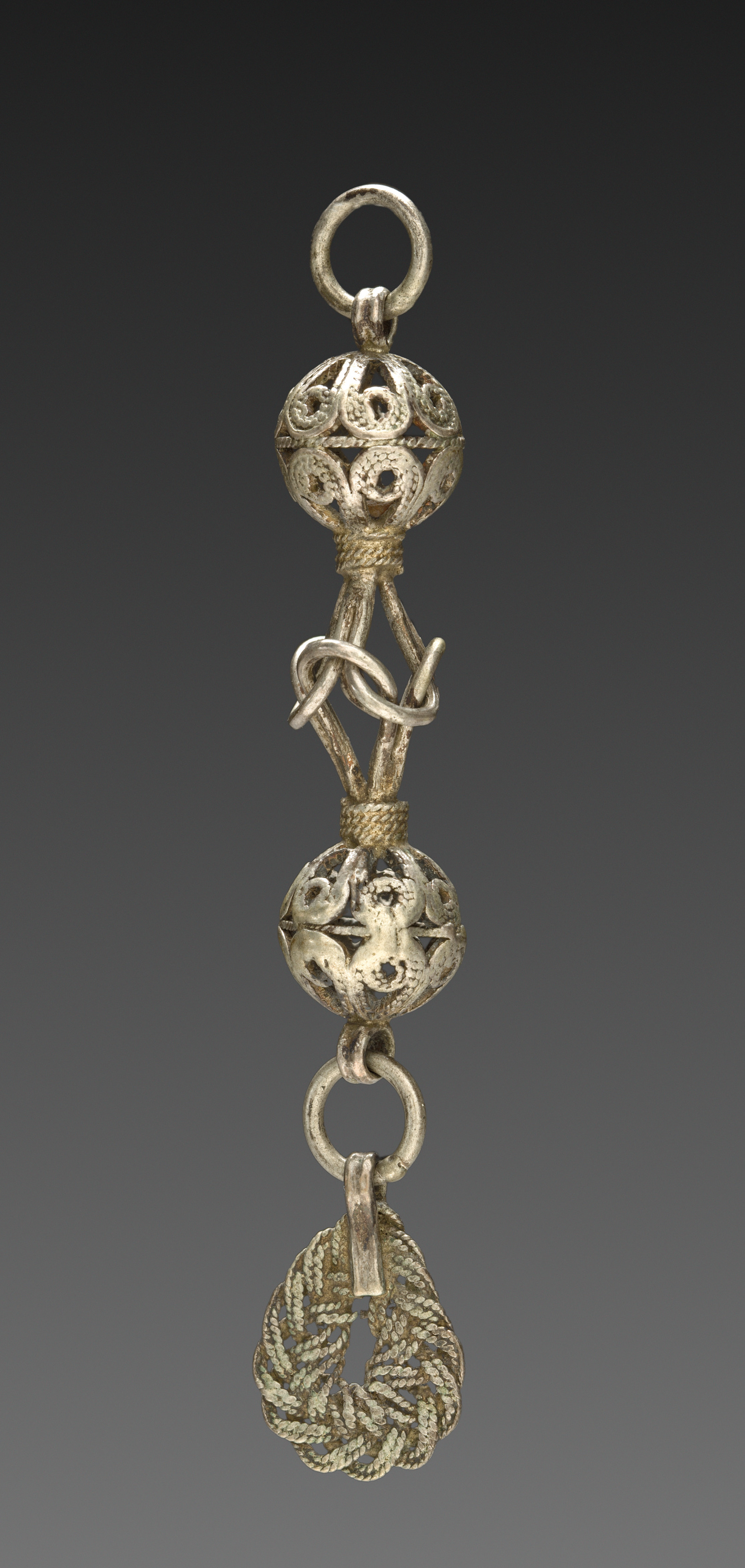 Gold-colored metal object with three main parts. Top part is a sphere with filigree and a small loop at the top. Middle part is a smaller sphere with filigree and a loop at the bottom. Bottom part is a teardrop-shaped wreath. The three parts are connected by metal loops and twisted rope-like metal. Gray gradient background. Title: Button. Artist unknown.