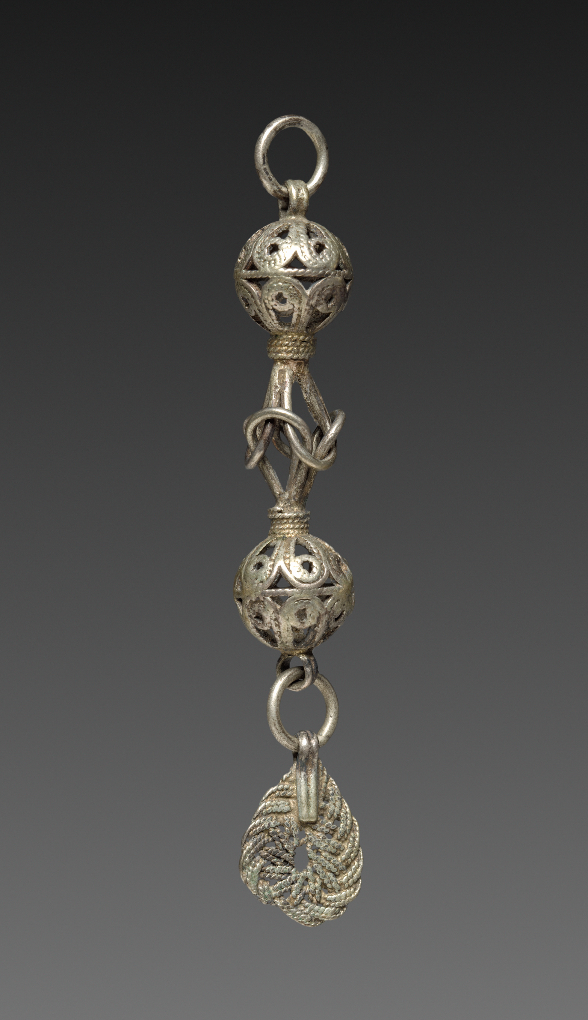 Metal object with three main parts. Top part is a small metal loop attached to a sphere with a floral design and four holes. Middle section has a twisted rope design below the sphere, and another sphere with a floral design and four holes. Bottom part is a teardrop shaped pendant with a rope design. Background is dark gray to light gray gradient. Title is "Button", artist not specified.