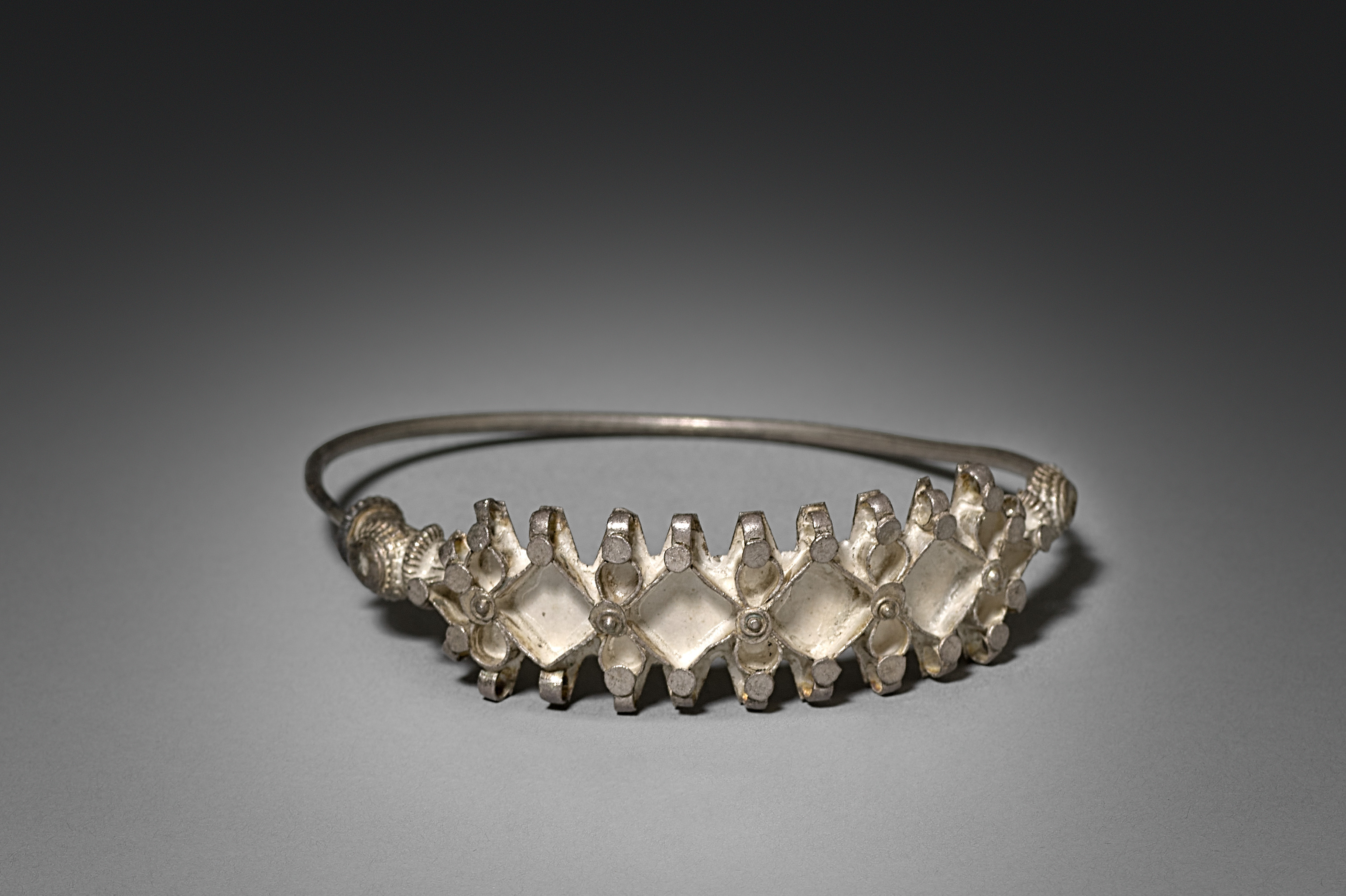 Metal nose ring with a repeating diamond-shaped design on the front. The nose ring is made of silver-colored metal. The band of the nose ring is thin and smooth. The front of the nose ring consists of 8 diamond-shaped sections. Each diamond shape has a small circular indentation in the center and is bordered by a raised design. The background is a gradient from dark gray at the top to light gray at the bottom. The nose ring casts a shadow on the surface below it, and the artist is unknown. The nose ring is titled "Nose Ring".