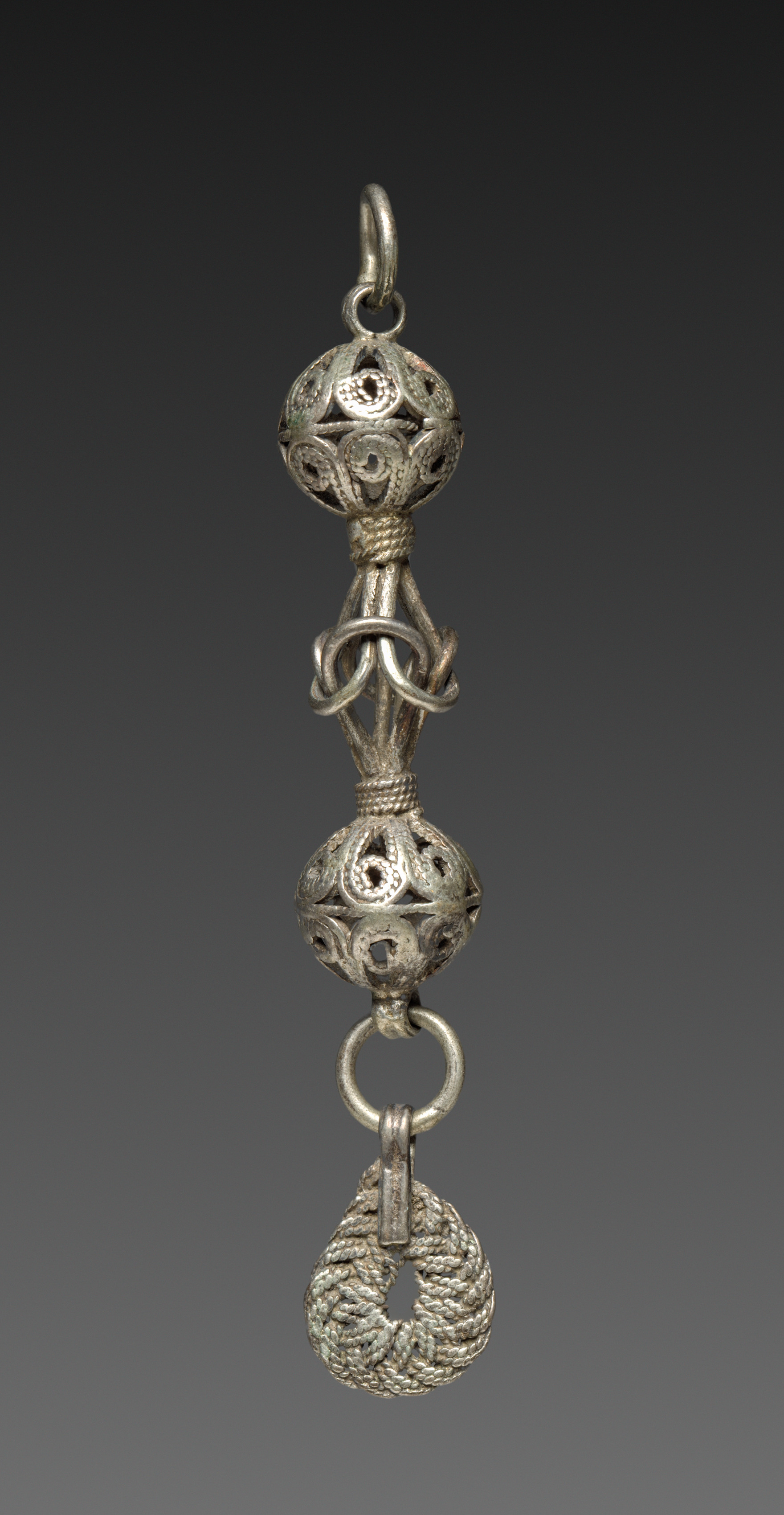 Metal object with a loop at the top, silver in color. Two spherical sections with patterned cut-outs, separated by a twisted metal piece. A ring connects to a teardrop-shaped section with a rope-like design. The background is dark gray, transitioning to lighter gray at the bottom. Title: Button, artist not specified.