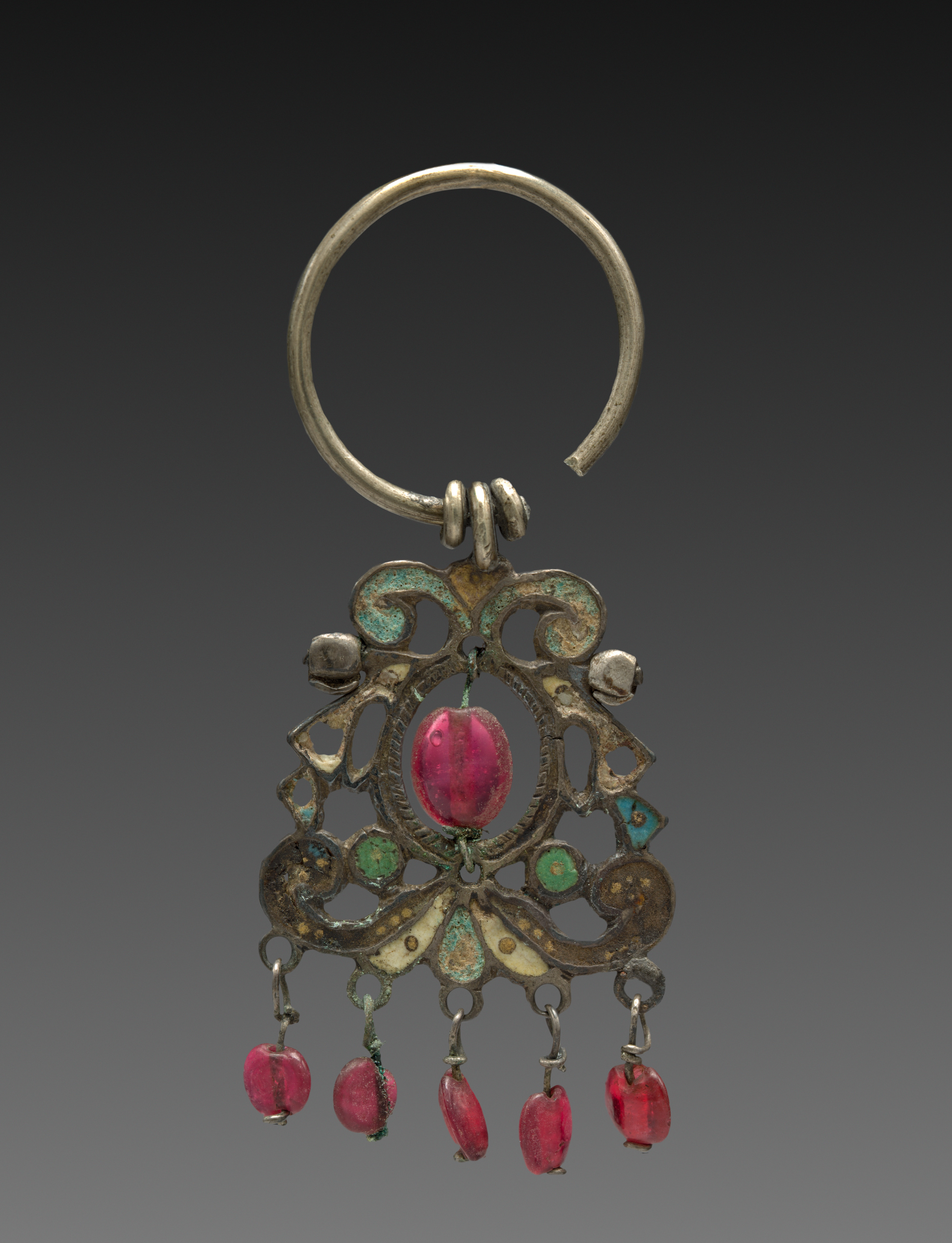 Earring by unknown artist. The earring features a circular metal hoop at the top, likely made of silver or gold, with a small gap at the top where it appears to be hinged. The main body of the earring is a filigree design with intricate patterns and shapes. It includes a large oval-shaped pink gemstone in the center. Smaller green gemstones are set around the central pink stone. Five smaller oval-shaped pink gemstones hang from the bottom of the earring, each attached by a small metal loop. The earring has a dark patina, suggesting age. The background of the image is a gradient from dark gray at the top to light gray at the bottom.