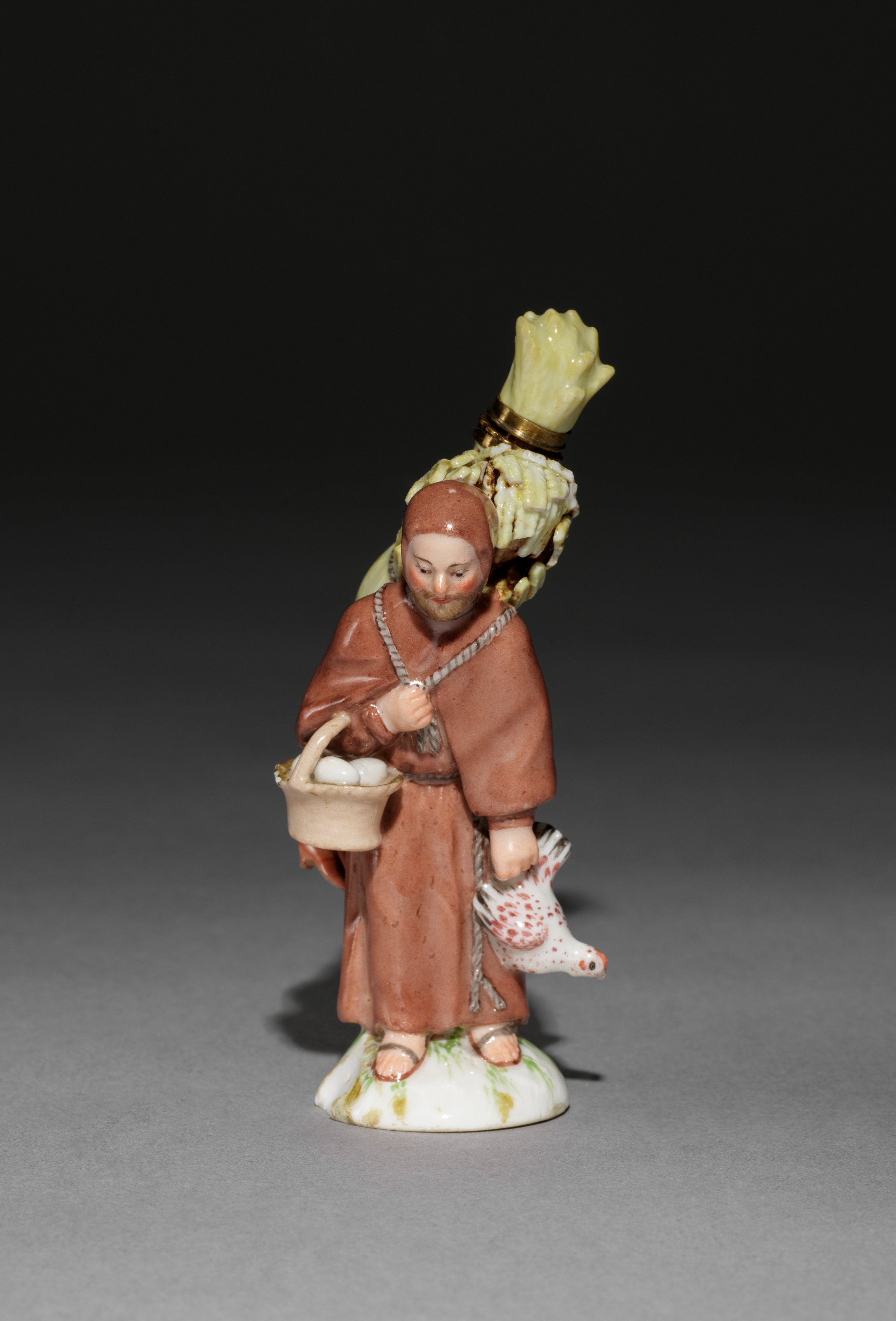 Ceramic scent bottle titled "Scent Bottle" by artist unknown. A figurine of a man wearing a reddish-brown robe and head covering, with a basket of eggs in his right hand and a white and red spotted dog on a leash in his left hand. A green object resembling a bundle of asparagus or a similar vegetable is tied to his back with a gold band. The figurine stands on a white base with green accents. The figurine has a glossy finish. The background is dark gray to black.