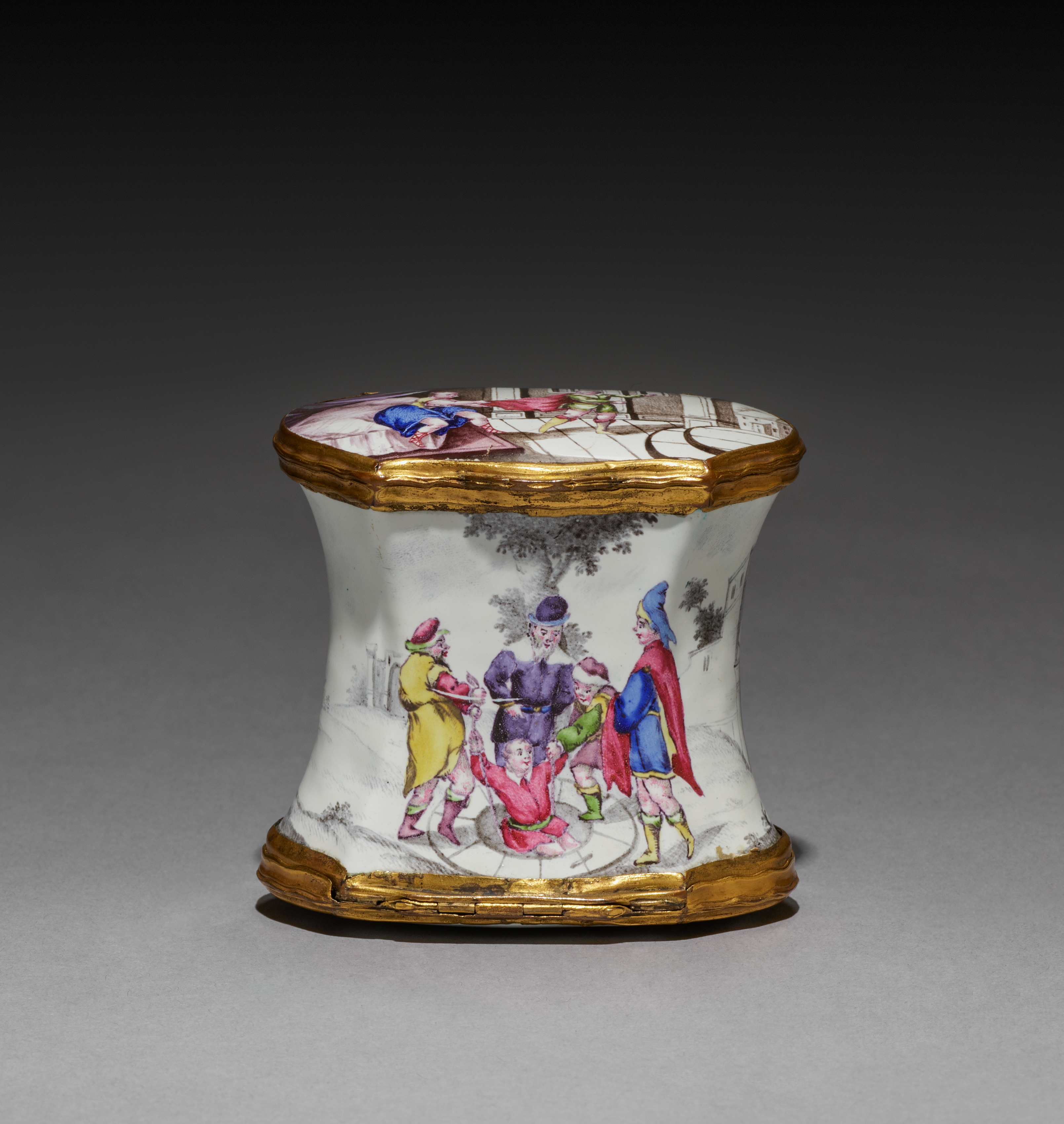 White ceramic box with gold trim, top and base, depicting a scene of people in colorful clothing on the sides and top. The box is shaped like a truncated cone, with a flat top and a slightly wider base. The top features a colorful scene with pink, blue, green, and brown elements. The sides show a group of people in colorful attire, including pink, purple, yellow, blue, and red, amidst a black and white background with trees. The box sits on a gray surface against a dark gray background. Title: Box. Artist unknown.