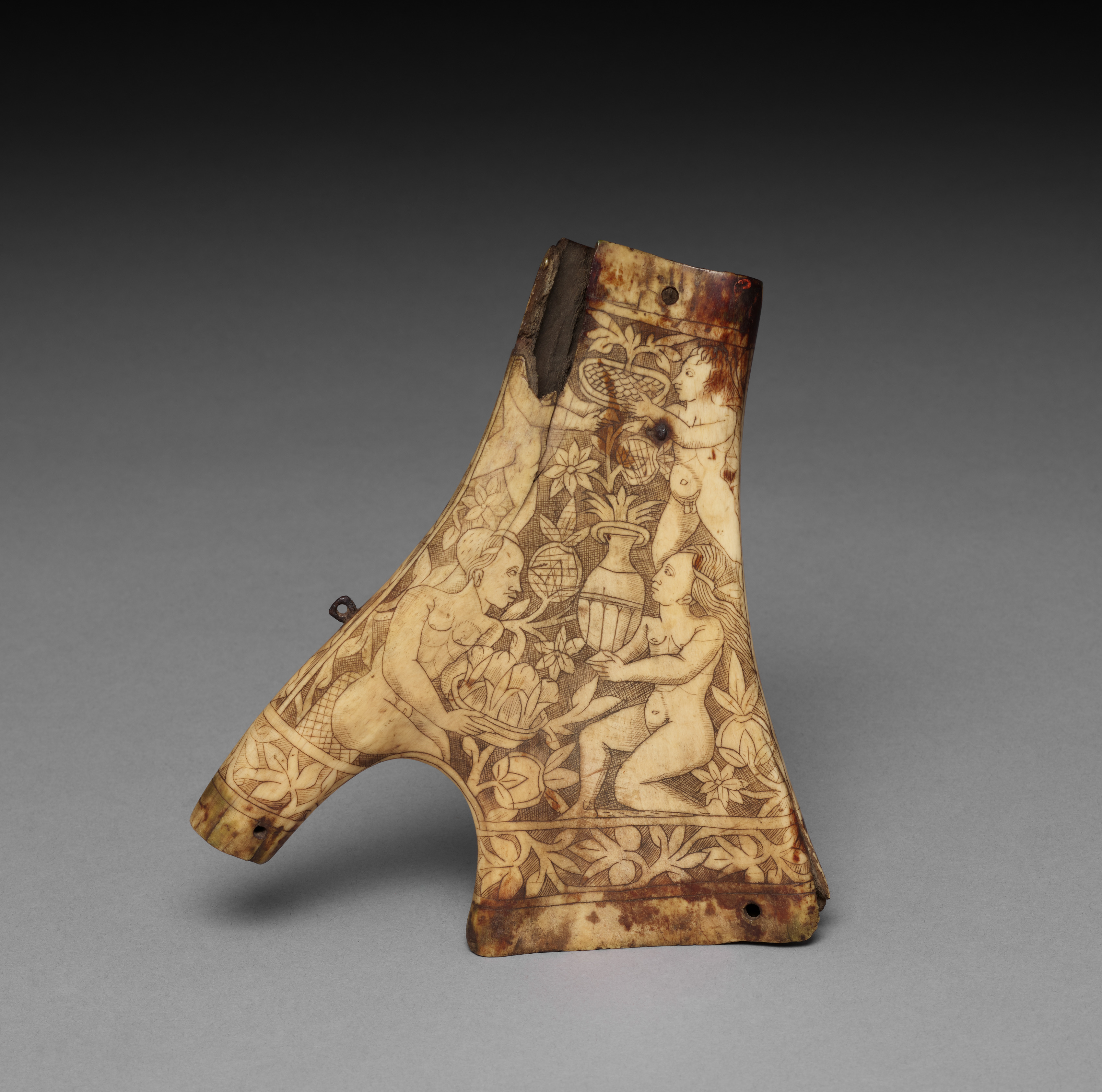 Powder Flask by Unknown. The object is a Y-shaped, off-white, possibly bone or ivory, powder flask. The flask features intricate etchings of two nude people and various plants. There are two holes on the top and one at the bottom. The background of the image transitions from dark gray to light gray. The flask appears to have a dark brown stain or rust on parts. The etchings depict a scene with foliage and a vase. The people in the etchings are engaged in an activity involving a bowl or basket.
