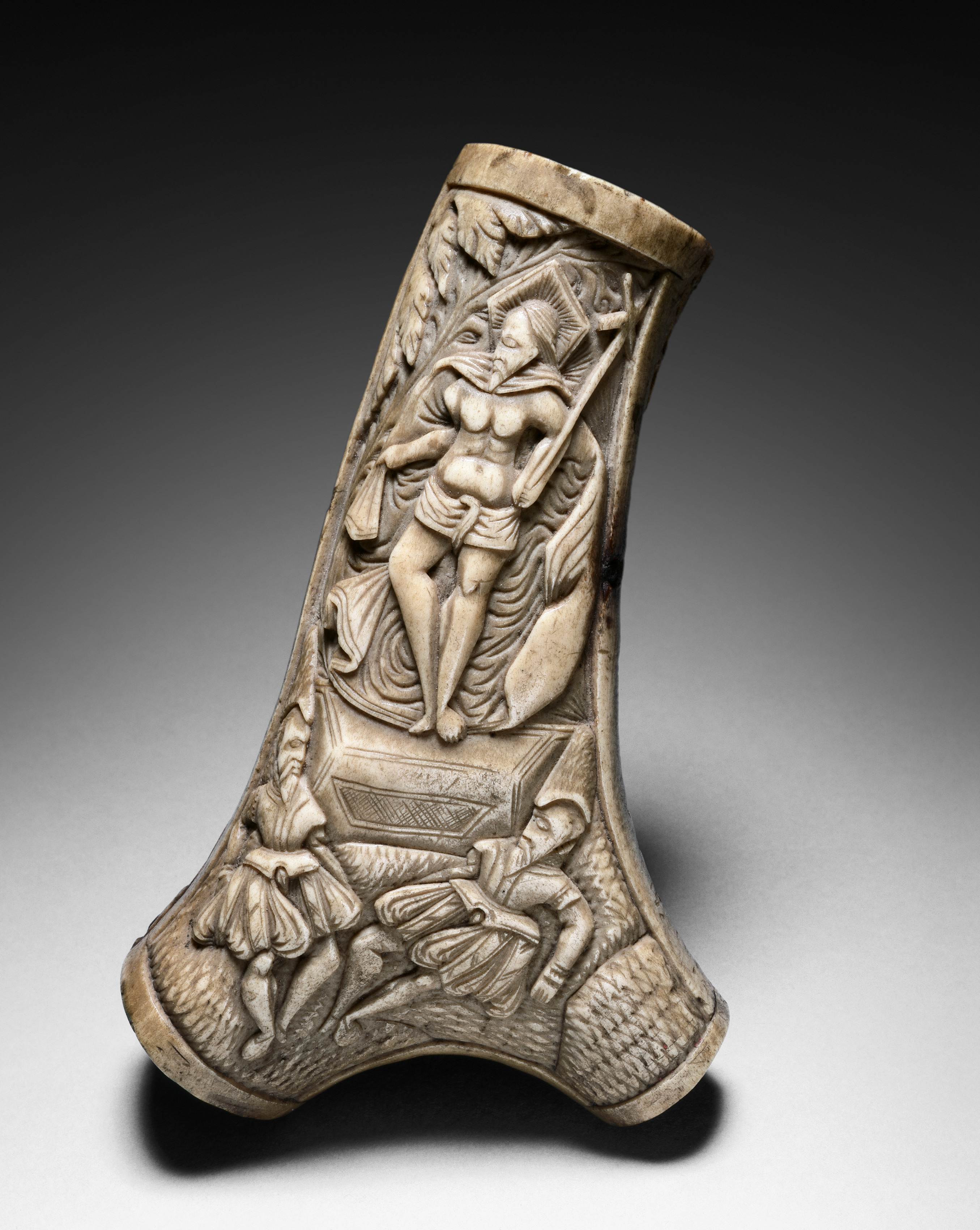 The object is a grey-brown, stone or metal powder flask, called "Powder Flask", created by an unknown artist. The object is shaped like a wide, flat triangle with the top curved inwards to form a small opening. The object has a flat base and three curved sides. The object features intricate carvings, including a man with long hair in a short cloth standing on a rug with a spear in one hand and a flag in the other. The bottom of the object depicts two men, one crouched down with a container near a woven basket and another standing with a bow and arrow. The object's surface is decorated with leaves and other designs. The background of the image is a gradient from black to white, with the object casting a shadow on the surface below it.
