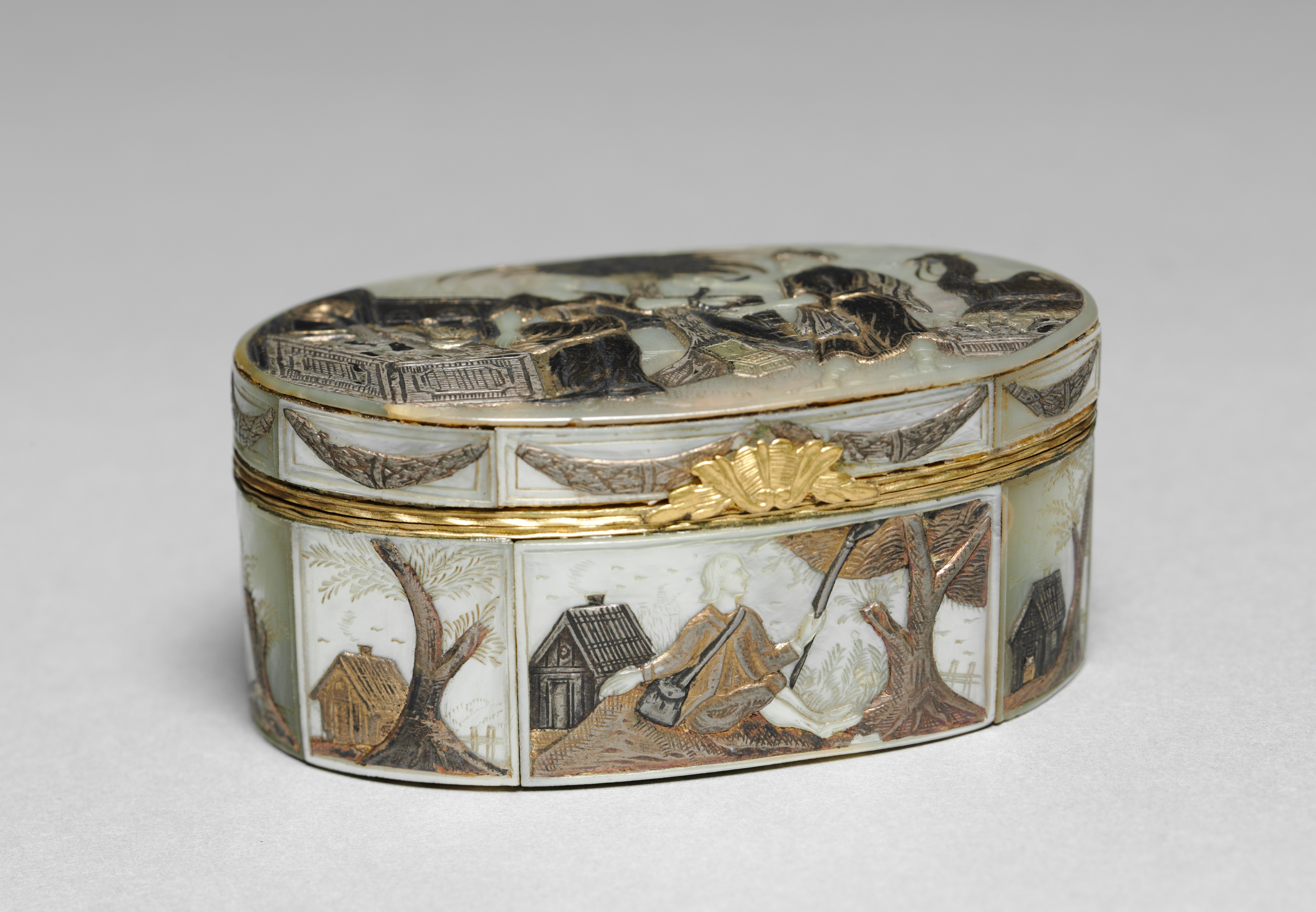 The Snuff Box by artist is a small, oval-shaped container with a hinged lid. The box has a white background with gold, black, and brown designs. The lid features a scene with buildings and trees. The sides of the box have four panels depicting scenes of people and landscapes, including a woman sitting on the ground holding an umbrella, a house, and trees. The box has a gold clasp in the shape of a shell and a gold band around the middle. The box is sitting on a plain gray surface. The overall design is intricate and ornate.