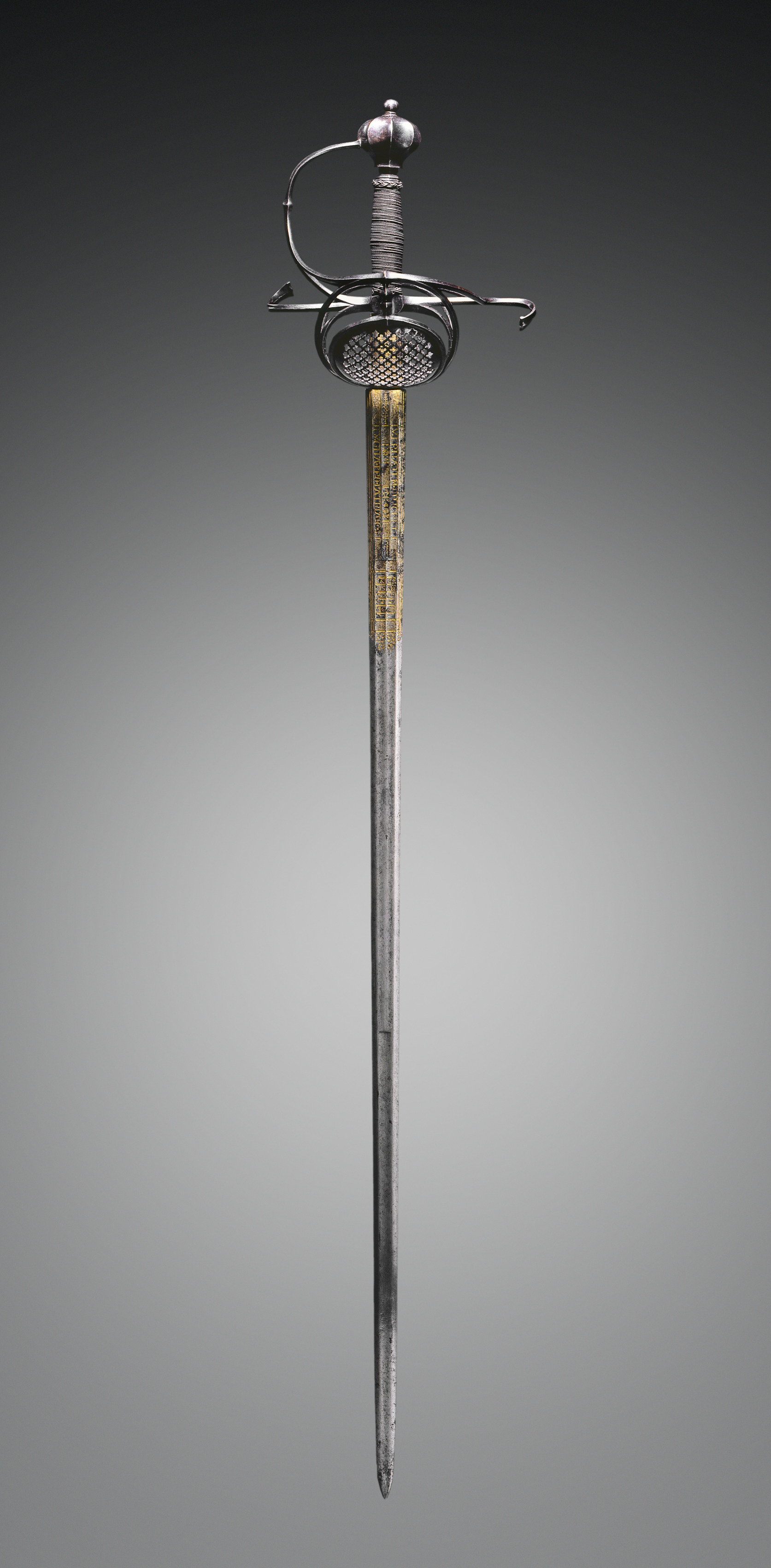 Rapier by Clemens Horn. The rapier has a long, slender blade with a pointed tip. The blade is mostly silver with a yellow stripe running down the center. The hilt is made of metal and features a spherical pommel on top. A curved guard extends from the pommel, with two side bars on either side. The grip is wrapped in yellow material, possibly wire or fabric. The background of the image features a gray gradient transitioning from dark at the top to light at the bottom.