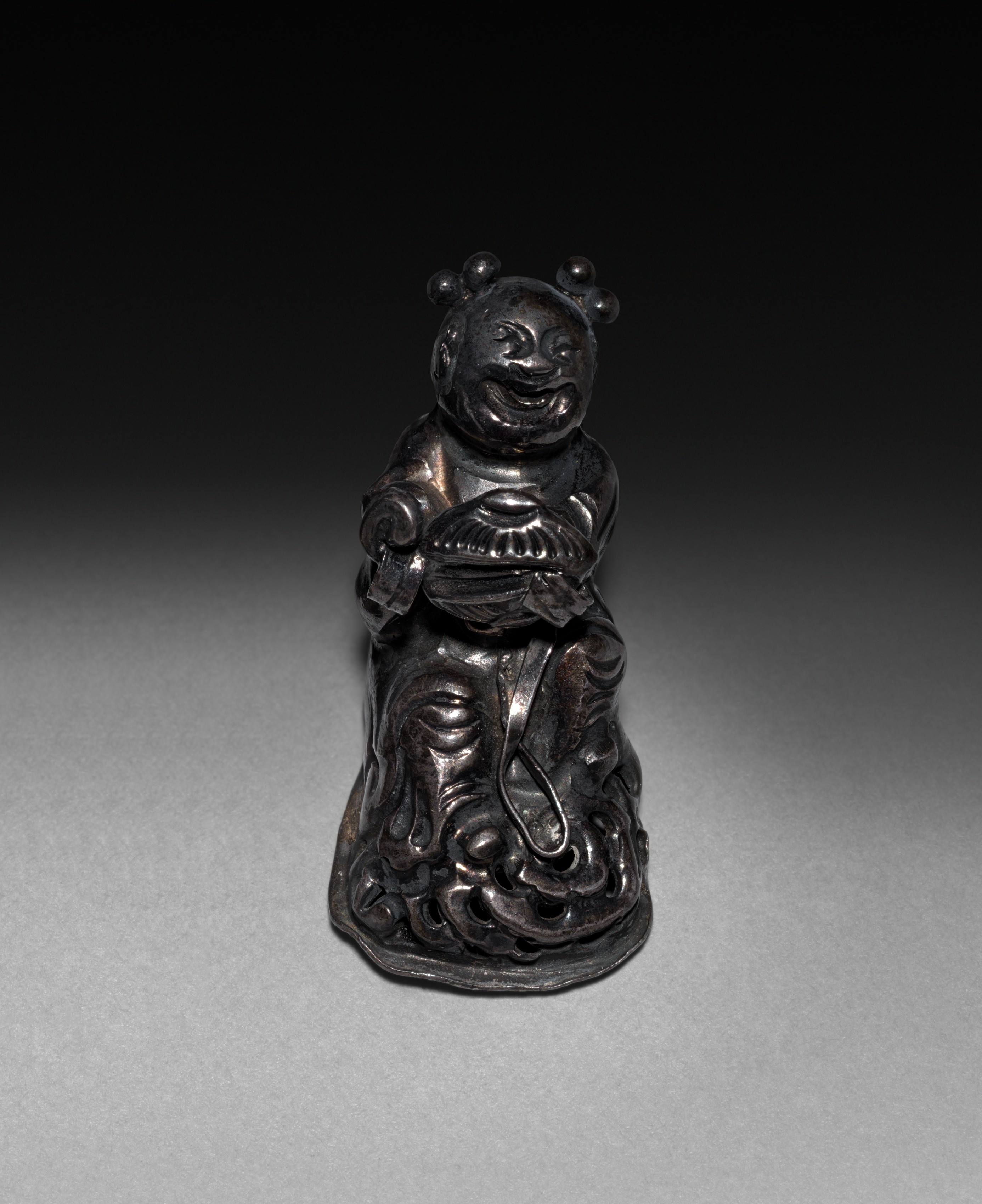 The sculpture "Seated Figure" by an unknown artist depicts a small, dark-colored statue with a smooth, shiny surface. The statue appears to be made of metal, possibly bronze or another dark-colored material. The figure has a round head with three small balls on top, resembling a crown or hairdo. The face is smiling and has almond-shaped eyes. The figure wears a robe with long sleeves and a sash around the waist. The robe is intricately carved with swirling patterns. The figure sits on a base with a wavy edge, also decorated with swirling patterns. The background of the image is black at the top and fades to gray at the bottom.