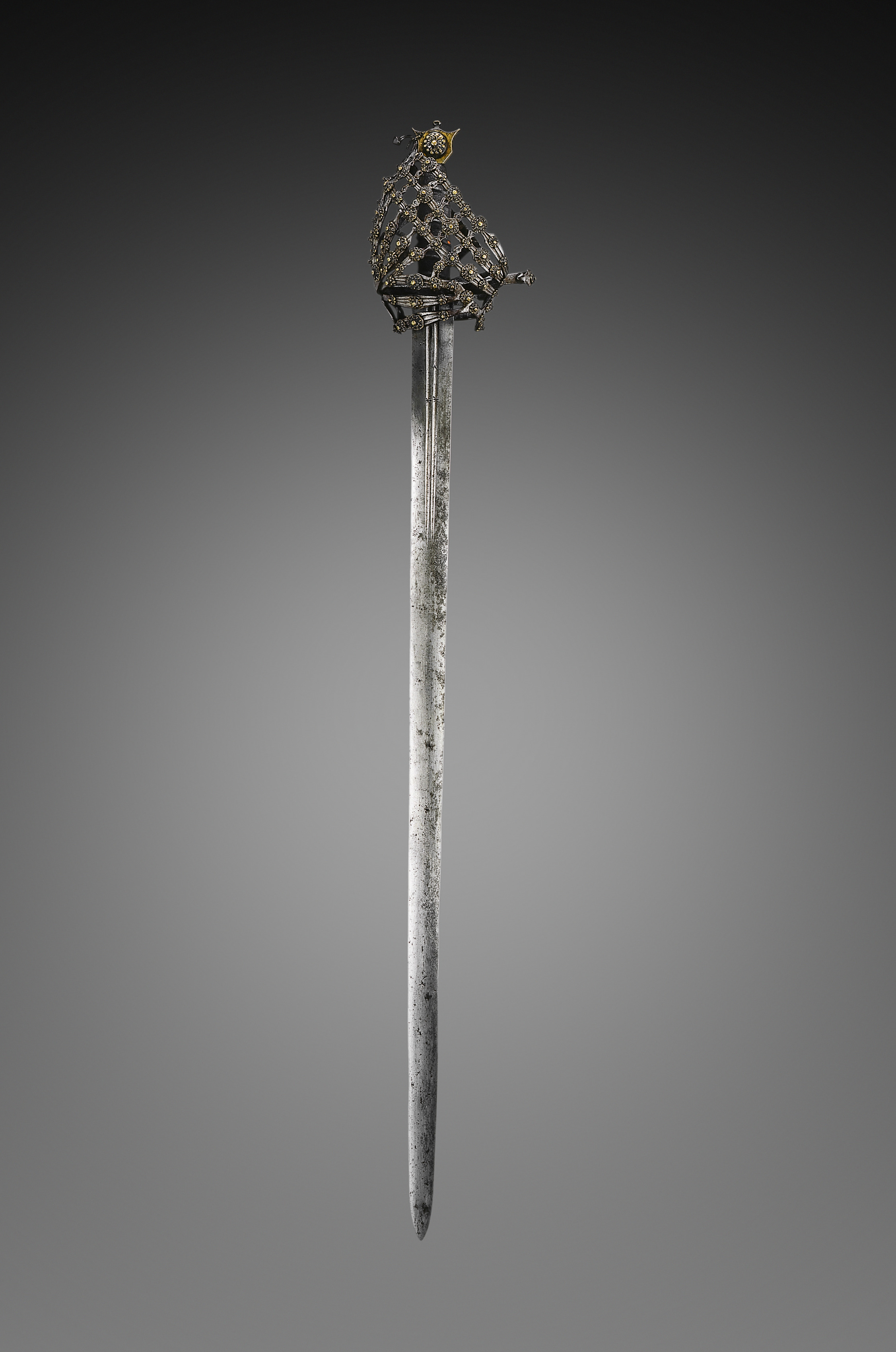 Schiavona Broadsword by Unknown. The sword has a long, narrow blade with a pointed tip. The blade is silver-colored with darker spots and a slight curve at the end. The hilt is made of metal and features a latticework design. The top of the hilt is dome-shaped with a gold-colored finial. The finial has curved shape and appears to be ornate. The background is a gradient that transitions from dark gray at the top to light gray at the center and back to dark gray at the bottom.