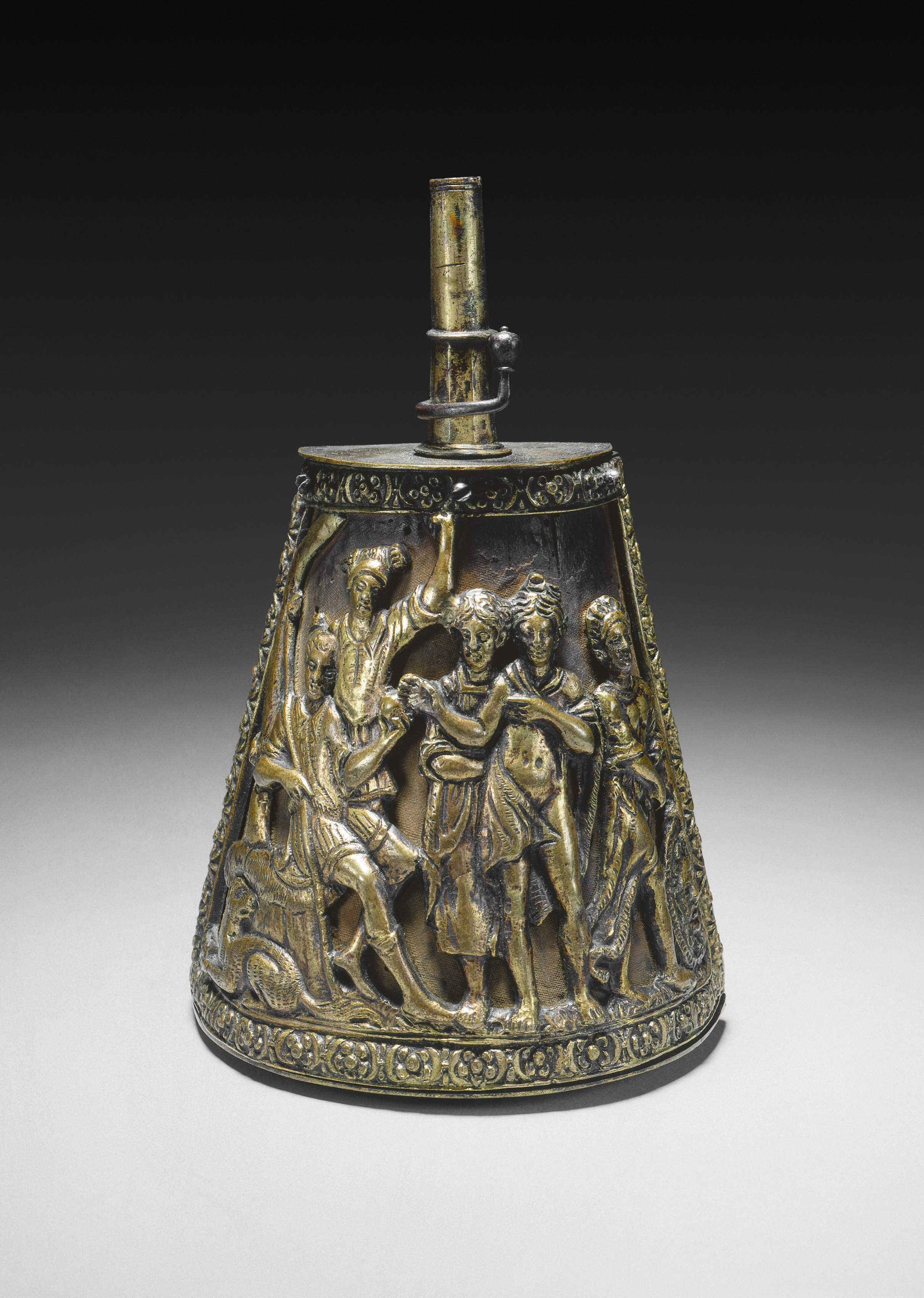 Powder flask by Hans Stopler, a brass, cone-shaped flask. A cylindrical spout with a small handle is on the top. The bottom and top have raised decorative borders. Most of the body is relief decorated with four figures, one on each side, engaged in a lively fight or embrace. The background fades from black at the top to white at the bottom.