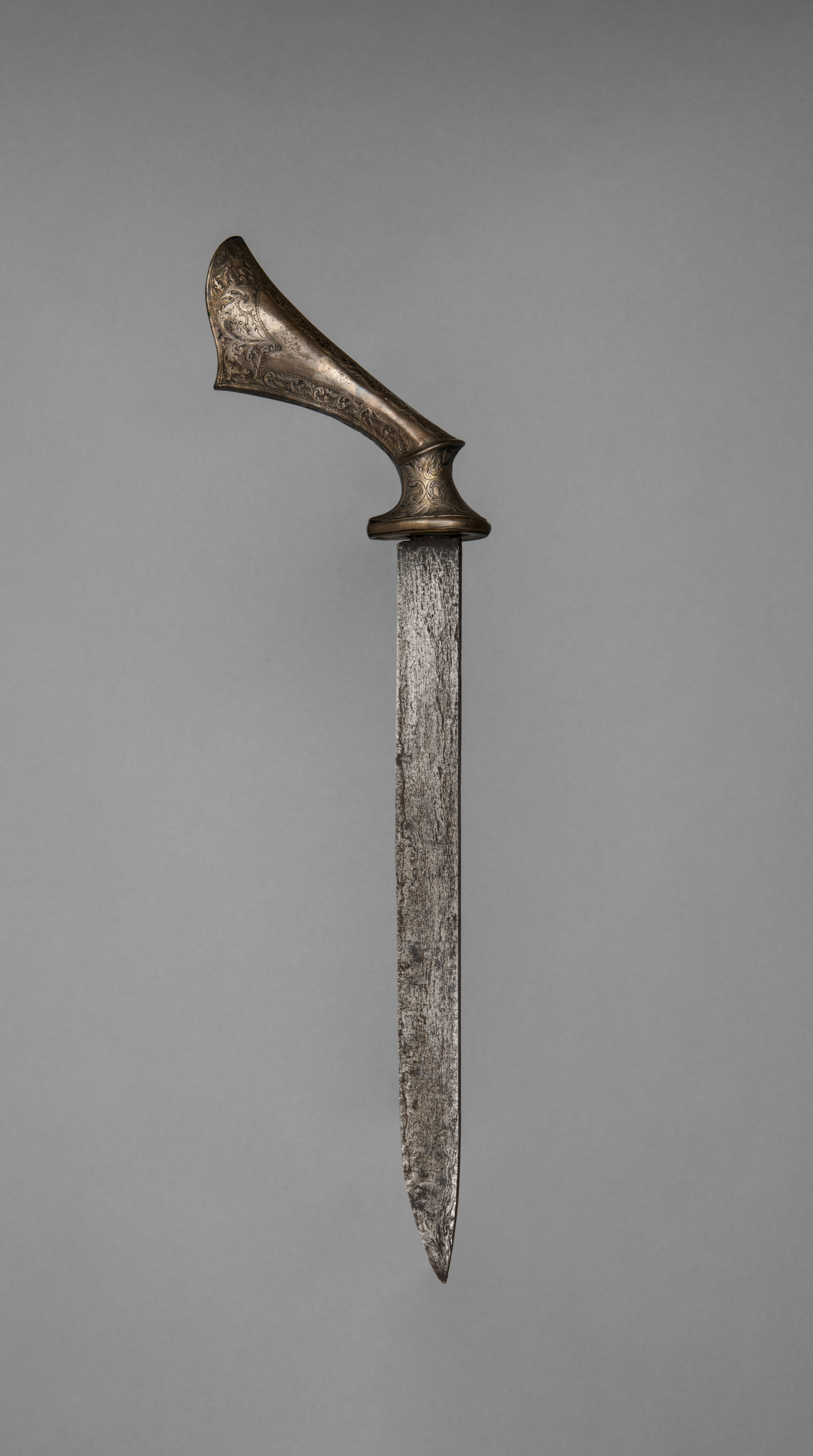 Knife by Artist. The object in the image is a knife. The knife has a long, thin blade with a pointed tip. The blade appears to be made of metal and has a rough texture. It is mostly straight with a slight curve near the tip. The blade is gray with darker areas. The handle of the knife is curved and made of metal. The handle is decorated with engravings. The background of the image is a solid gray color. The knife is positioned vertically in the center of the image, with the blade pointing downwards.