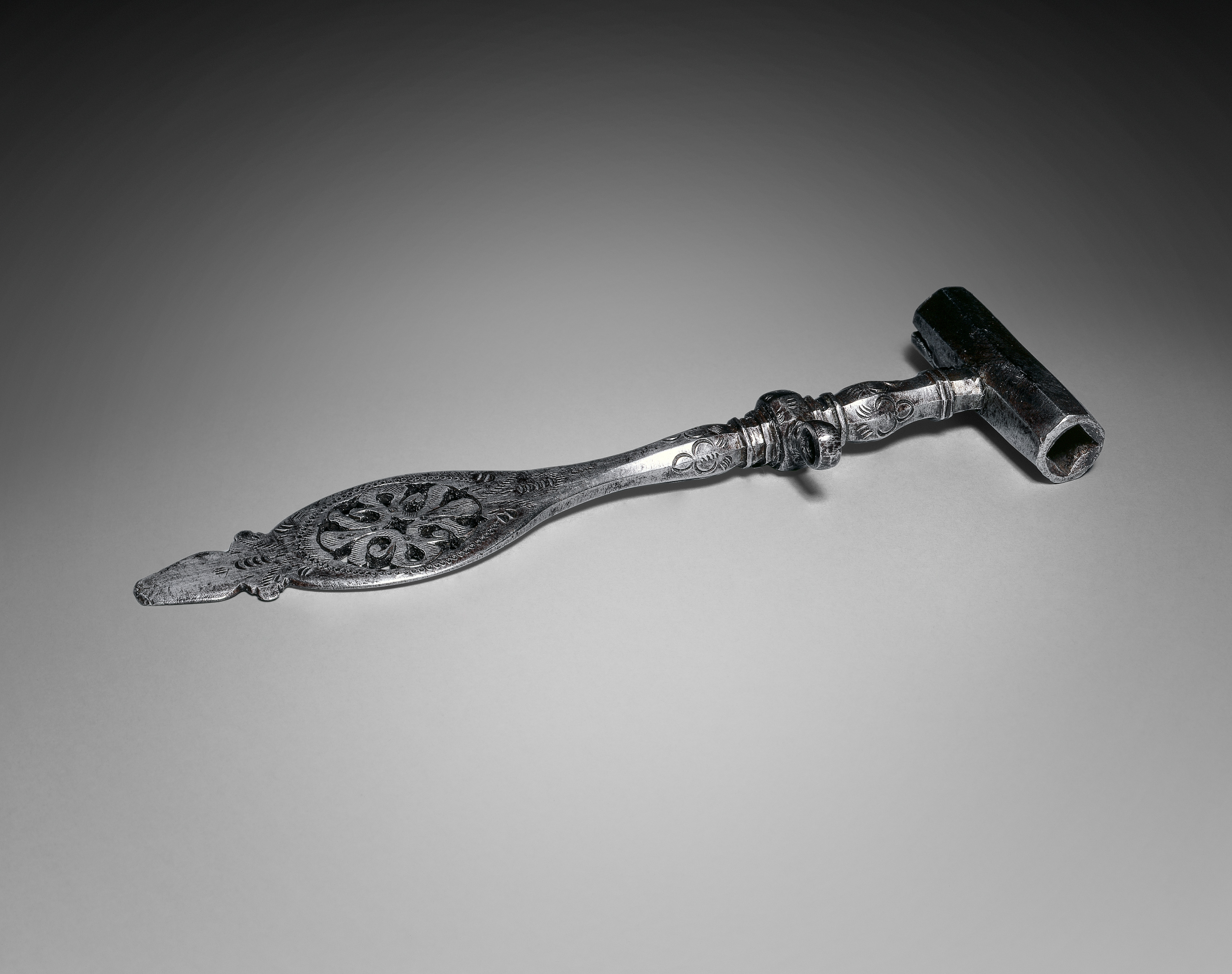 The image shows a spanner for a wheel-lock gun. The spanner is made of metal and has a long handle with decorative engravings. The handle is thin and has a curved end with a design resembling a crocodile or alligator head. The handle features intricate designs, including floral patterns. A short section of the handle is thicker and has a rounded edge. The spanner's head is T-shaped and appears to be made of a thicker, darker metal. The T-shaped head is positioned on the right side of the image. The background of the image is a gradient of dark gray at the top to light gray at the bottom.