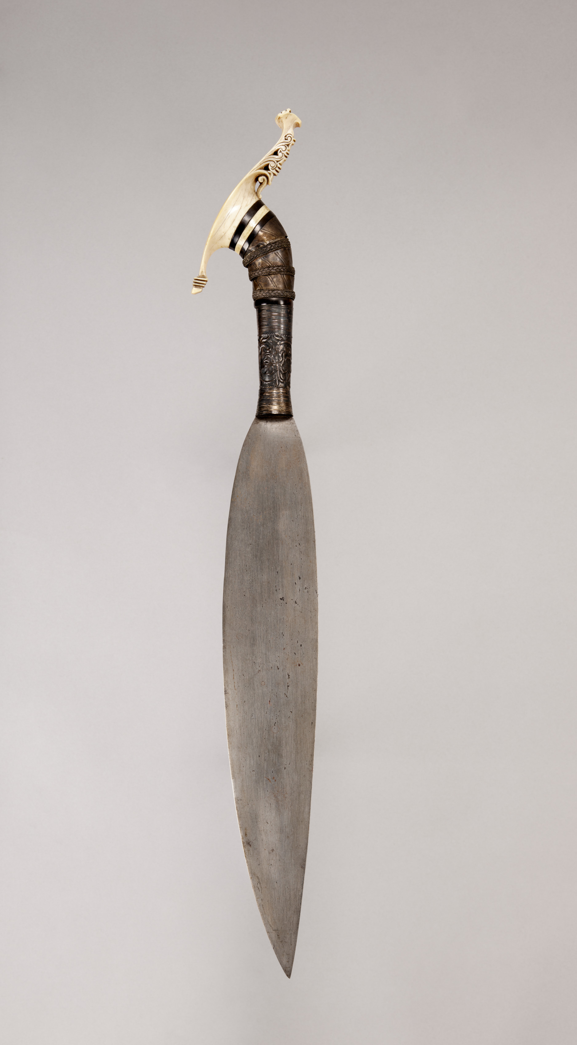 Sword (Barong) by Filipino. A long silver sword with a pointed tip and a straight edge. The hilt is dark brown with a gold-colored decorative piece at the top. The decorative piece is shaped like a bird's head. The handle has an intricate design. The background is gray.