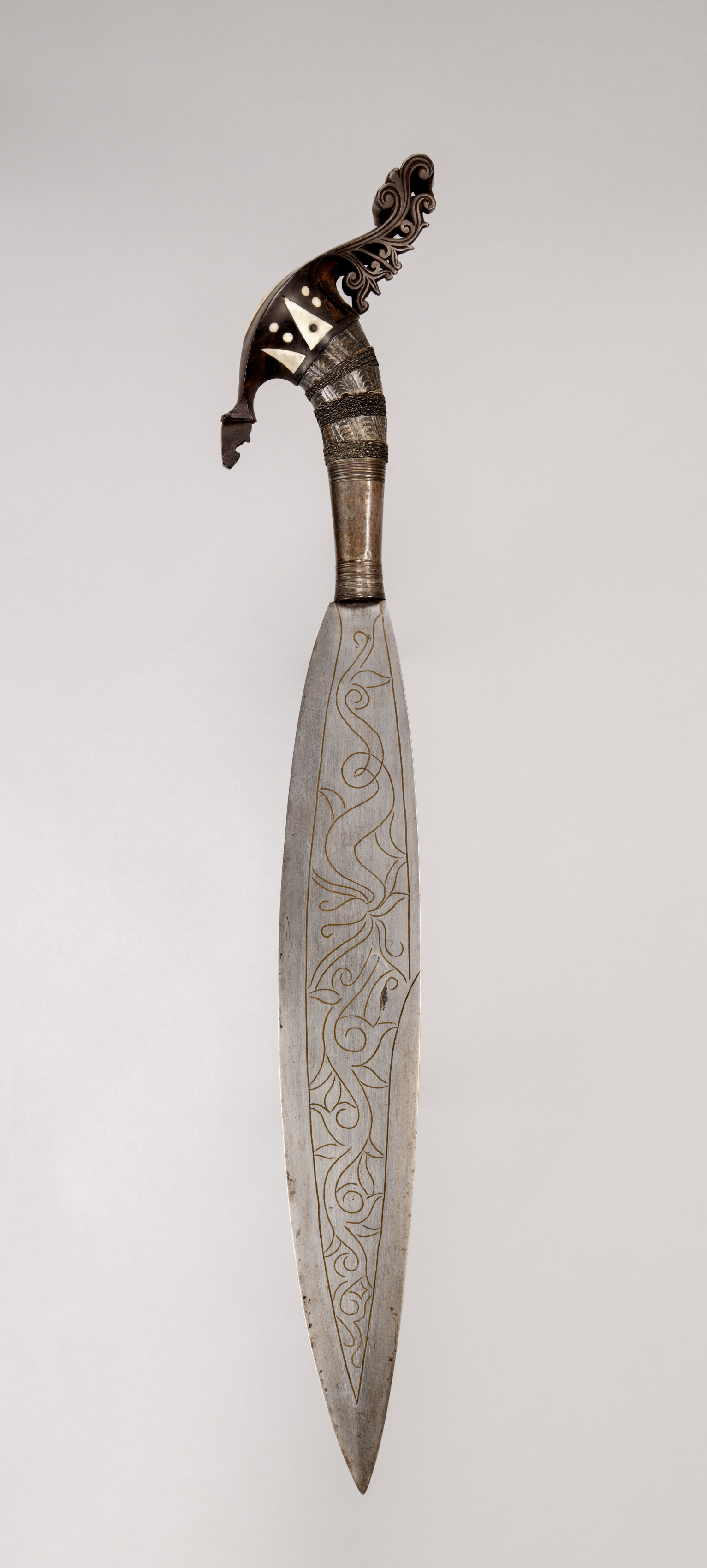 The sword, titled "Barong", has a long, narrow blade with a pointed tip. The blade is silver with an etched design that runs along its length. The hilt is dark brown with a curved shape and intricate carvings. The handle is wrapped in material with a patterned metal band around it. The guard is small and curved, with white inlays. The pommel is decorated with swirling designs. The background of the image is a plain gray color.