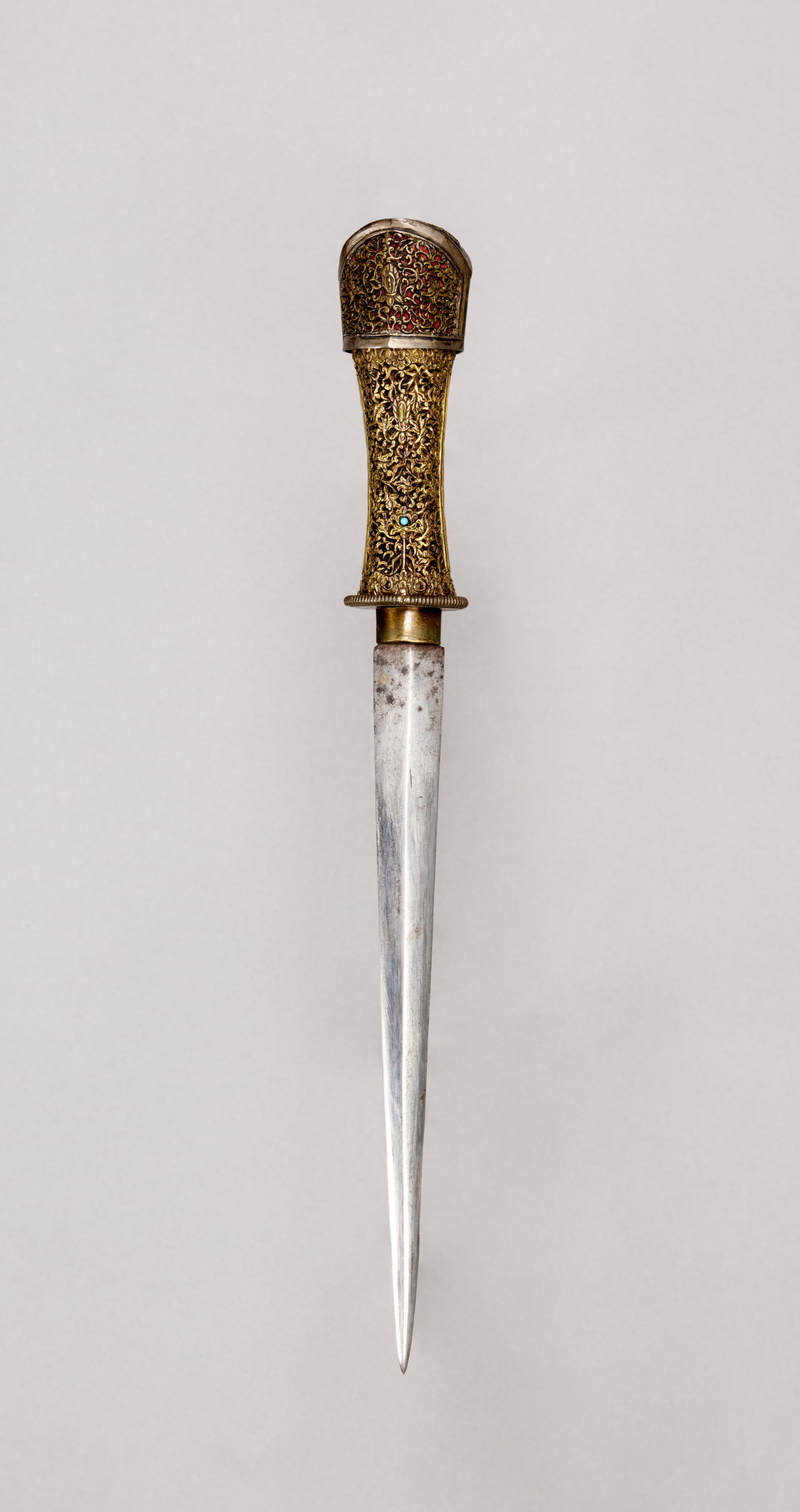 Dagger, long silver pointed blade with a gold pommel and handle base, handle gold with filigree.