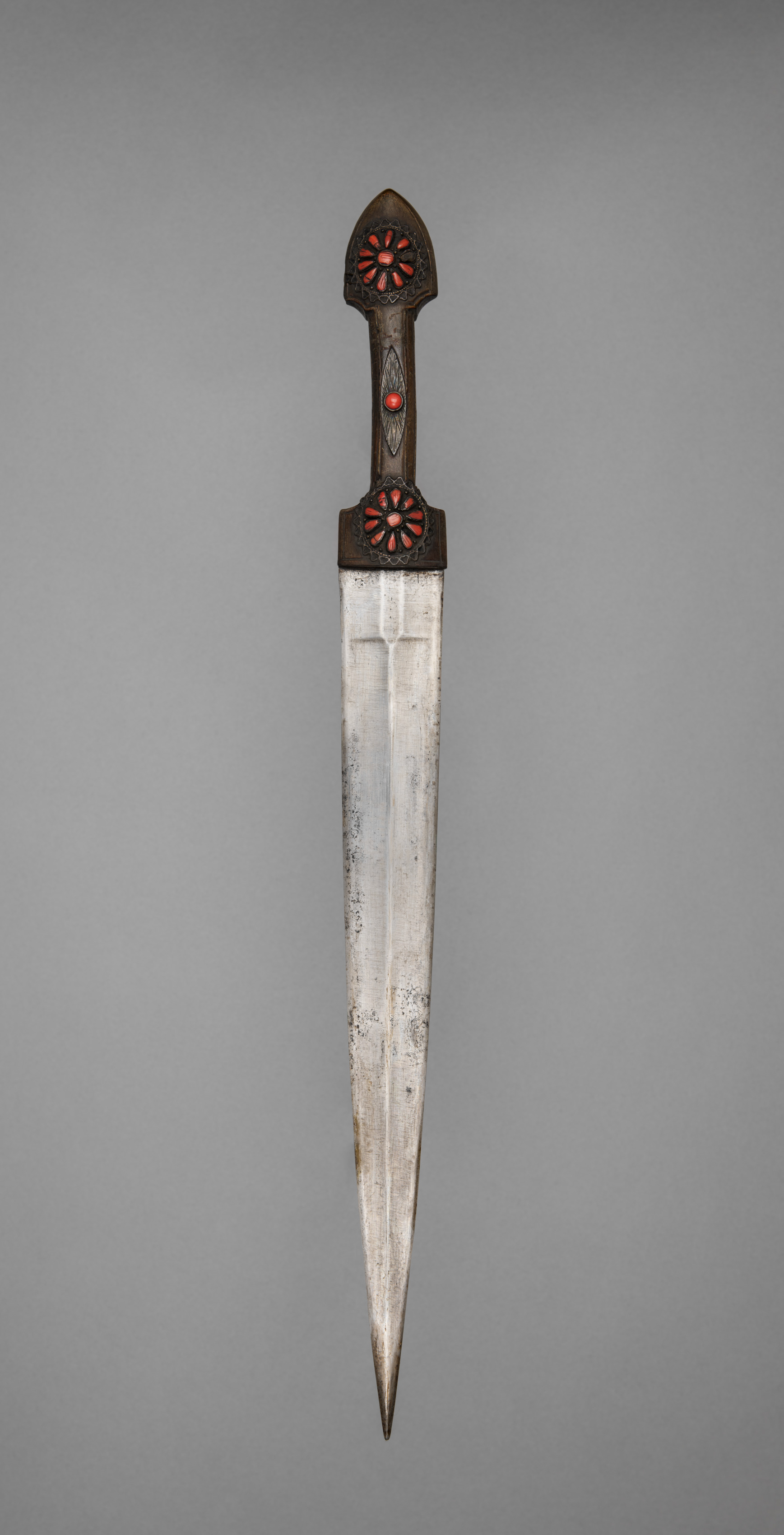 Metal dagger with a long, thin blade and a black handle; the handle has a red and black design on it. The blade is silver with a slight curve and a pointed tip. The handle is black with a red and black flower-like design on the top and bottom. There is a small red circle in the middle of the handle. The background is gray. Dagger (Khanjali) by artist not specified.