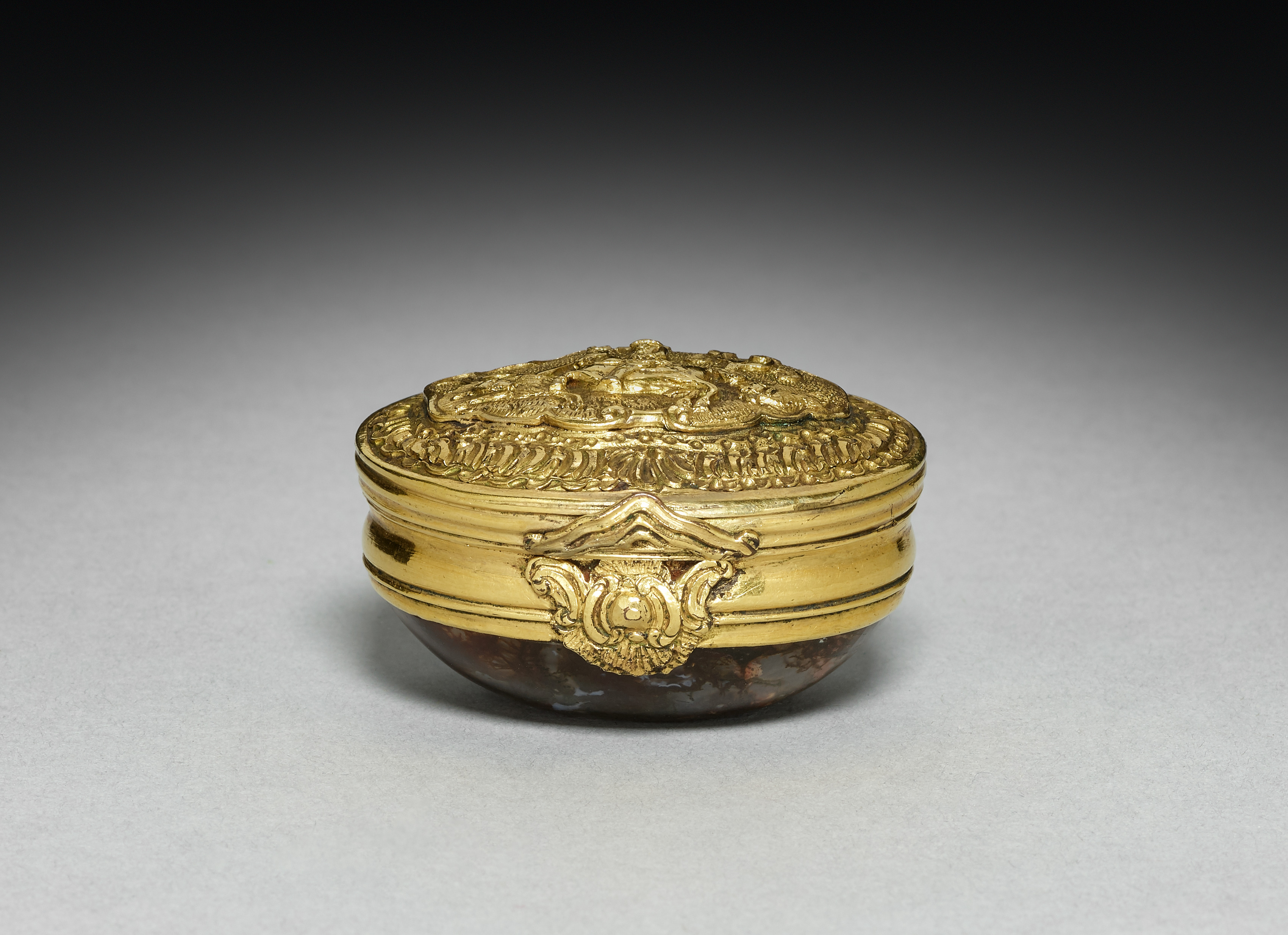 Golden-colored metal box with intricate designs on the lid and sides. The box has a rounded shape. The lid features a mix of raised patterns and engravings. A decorative element adorns the front of the box. The box has a dark-colored base. The background is gray with a gradient that gets darker at the top. The artist and title is "Box".