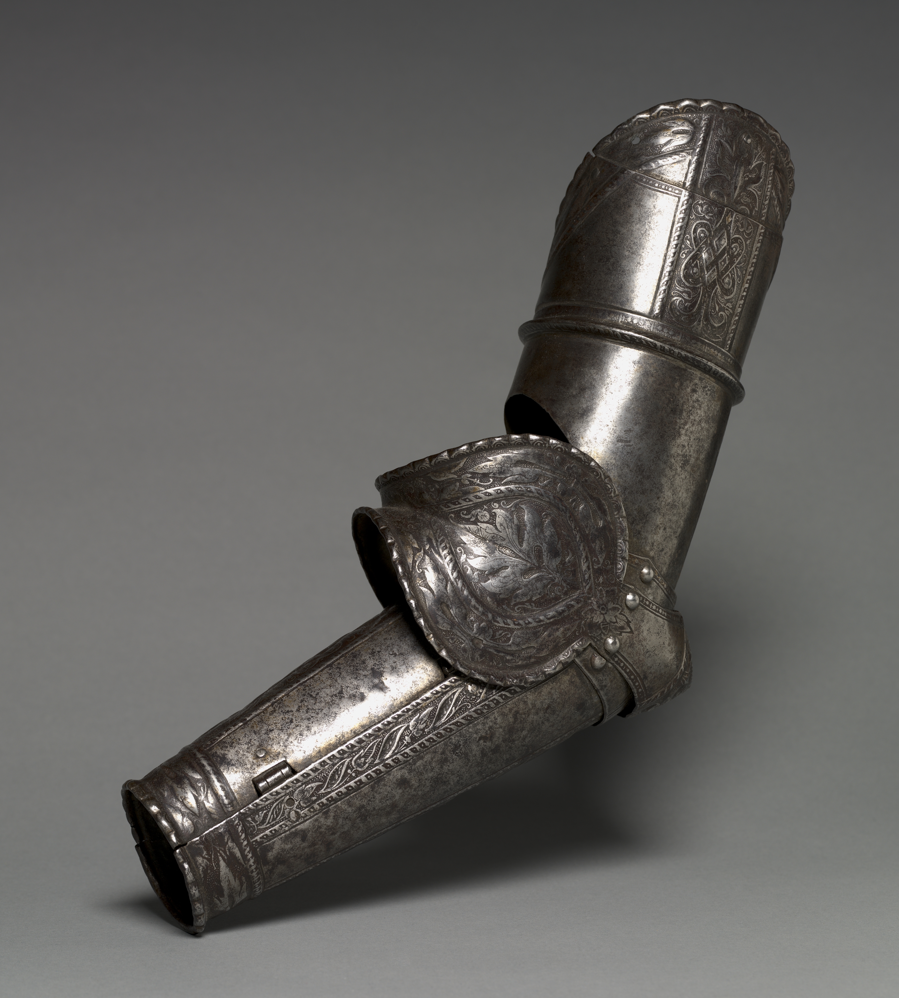 Metal armor piece with three sections: a lower cannon, a couter, and a rerebrace. The lower cannon is tubular and open at both ends, featuring etched designs. The couter is a curved, rounded piece with etched designs and three rivets on its side. The rerebrace is also tubular but closed at the top with a scalloped edge and etched designs. The background is gray, transitioning from dark at the top to light at the bottom. The armor piece is positioned diagonally, with the lower cannon pointing to the bottom-left.