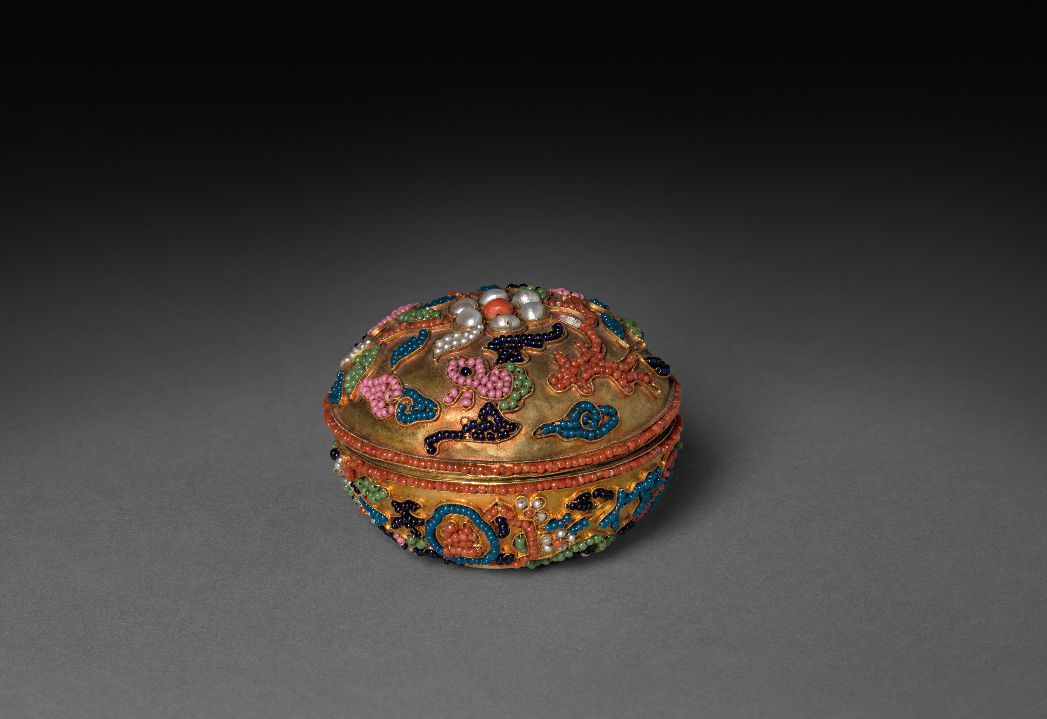 Round, gold-colored box with a domed lid. The box and lid are decorated with colorful enamel designs in blue, red, pink, green, and orange. The designs are intricate and include various shapes. The box has a narrow lip around the edge of the lid and a matching border around the base. The background is dark gray, with a subtle shadow cast by the box. The artist and title of the piece is "Box".