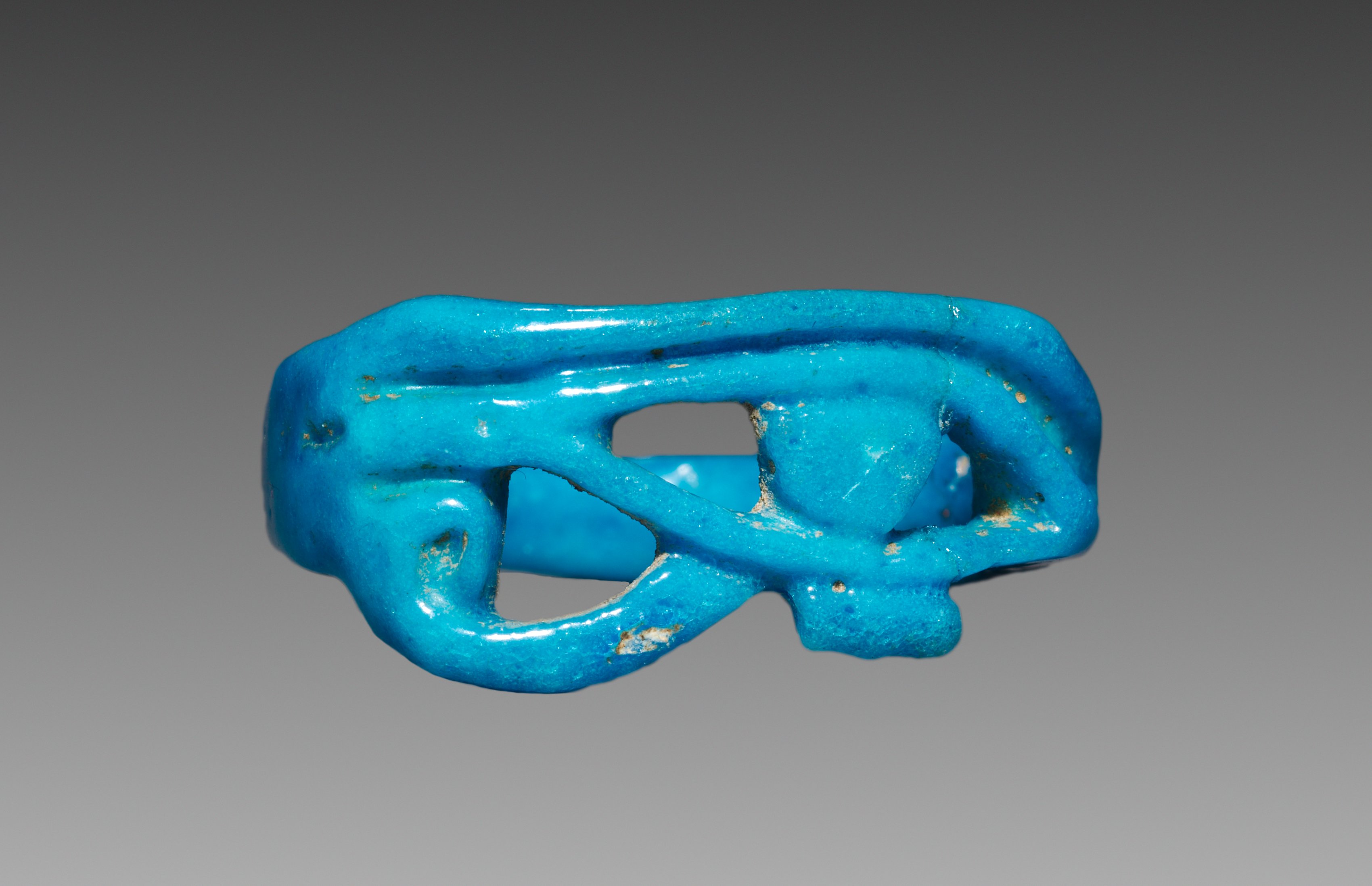 The Wedjat-Eye Ring by artist is a blue ring. The ring has a smooth, glossy surface with a bright blue color. It has a distinctive shape resembling an eye with a curved line on top and a loop at the bottom. The ring appears to be made of a type of ceramic or glass material, with small, light-colored specks and spots scattered across its surface. The background behind the ring is a gradient that transitions from dark gray at the top to light gray at the bottom.