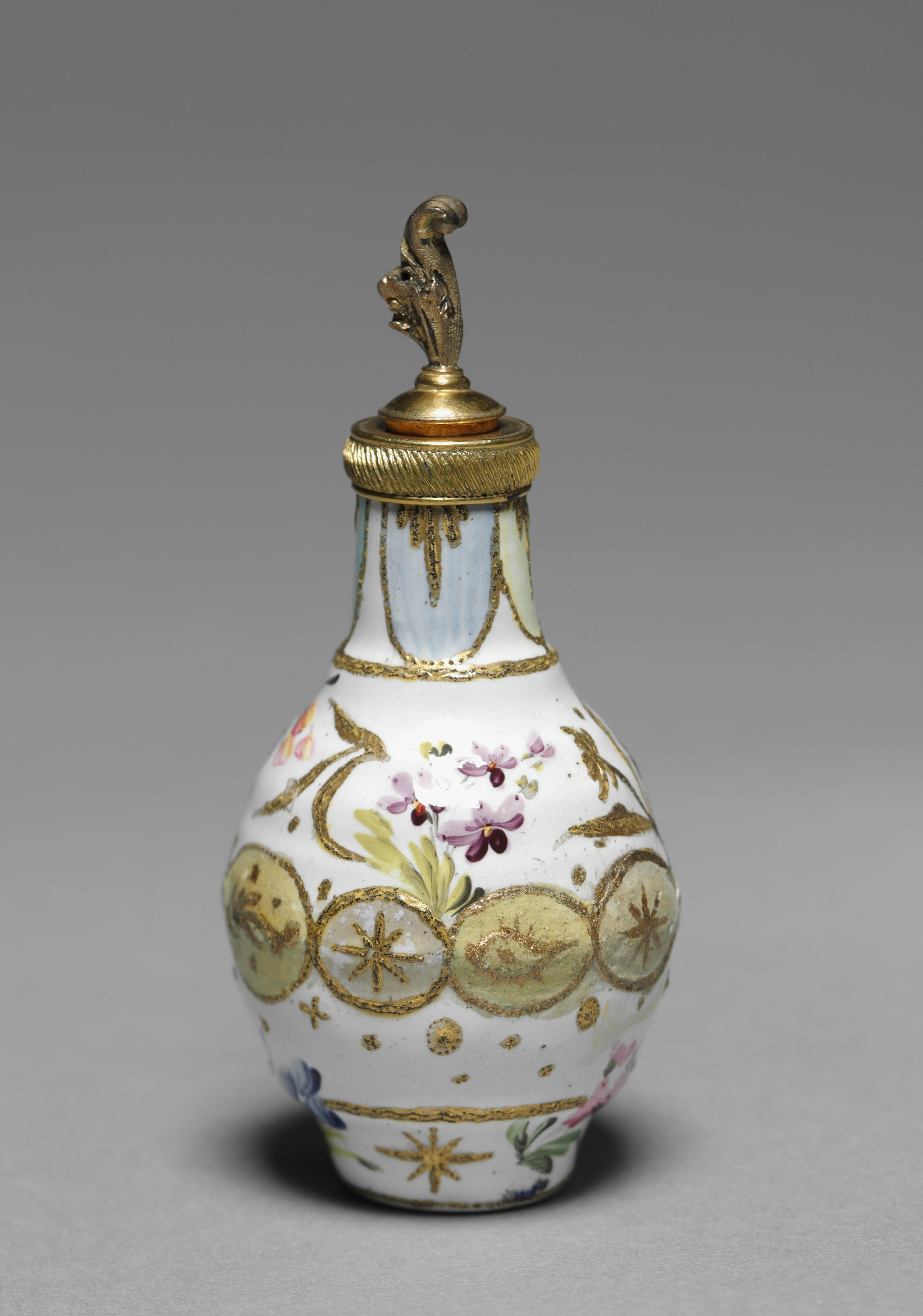 The object is a white, bulbous scent bottle with a narrow neck. It has a gold-colored metal lid with a handle on top that resembles a leaf or a stem. The bottle features gold accents and designs, including lines, dots, and stars. There are also floral patterns in shades of pink, purple, blue, and green. The background of the image is gray. The bottle appears to be antique and is attributed to Staffordshire Factory.