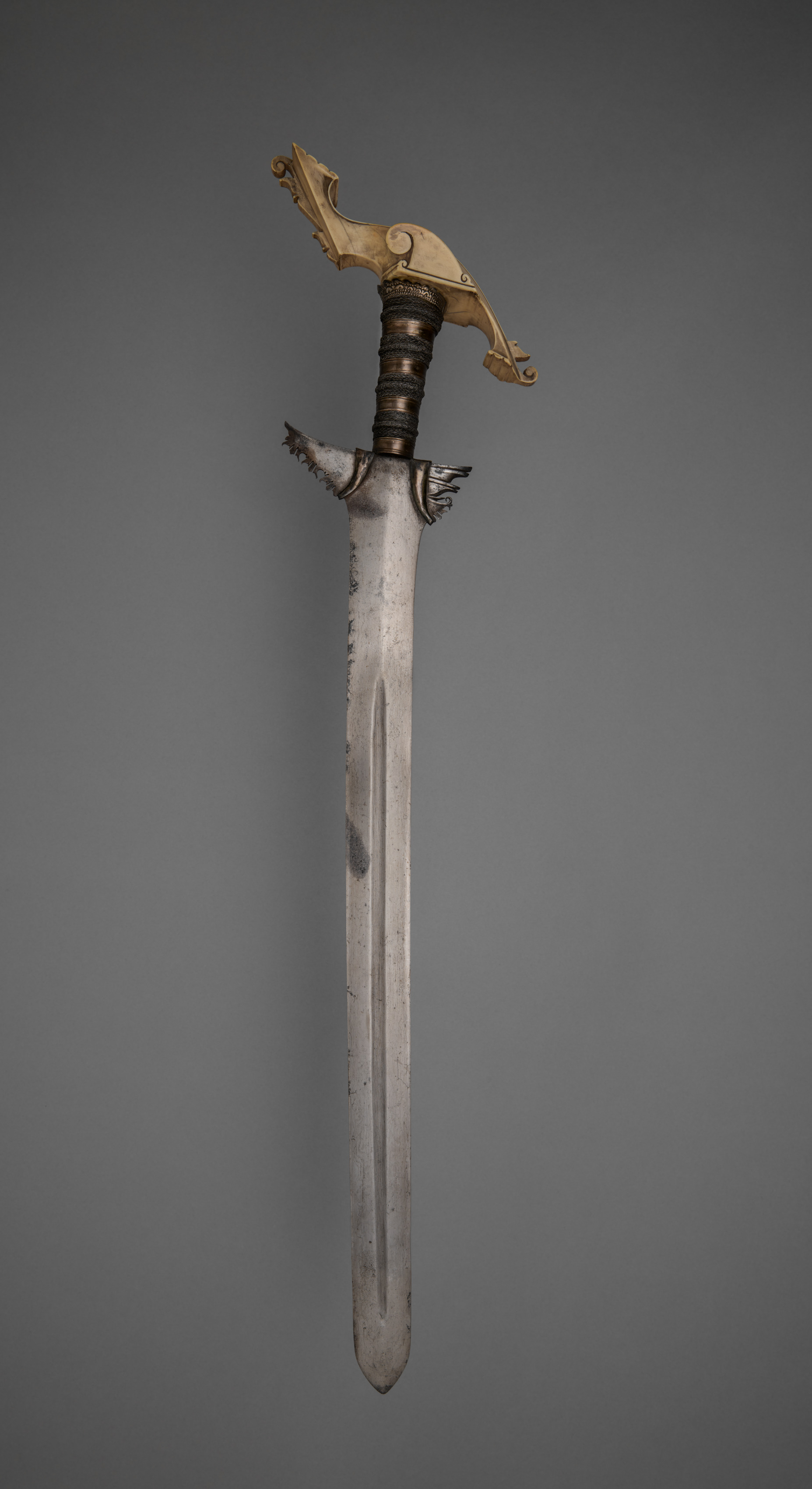 Sword (Kris) by artist. Long, slender silver sword with pointed tip. Sword hilt wrapped in black and brown cord, adorned with gold-colored metal piece curved like a bird. Two small metal protrusions on either side of hilt, resembling bird claws. Grey background.