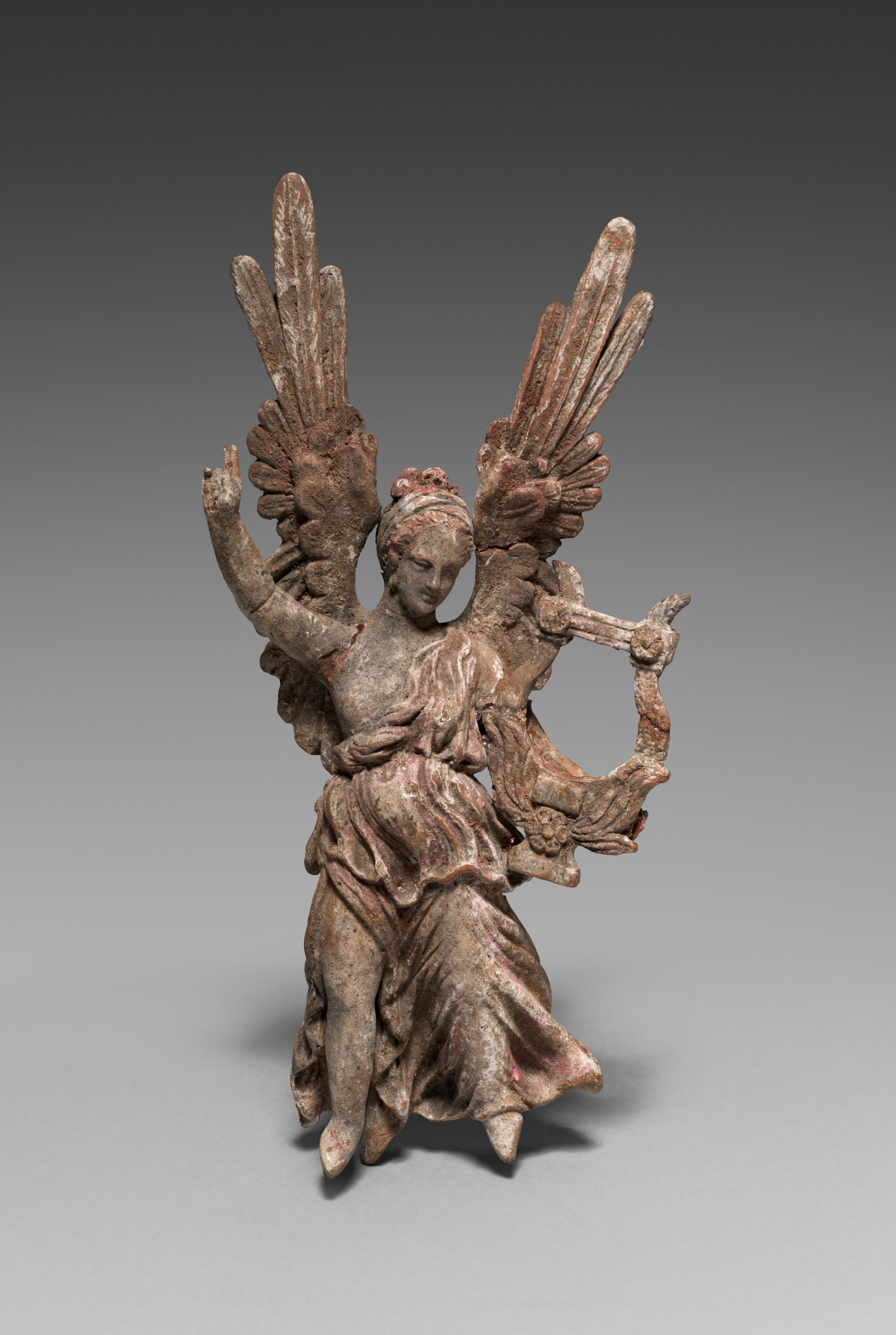 Figurine by Unknown Artist. The sculpture depicts a winged human figure with a reddish-brown color and visible signs of aging or weathering. The figure stands on one leg, with the other bent behind, wearing a long dress with folds and creases. The figure has short hair and appears to be looking down. Two large wings protrude from the back, each with long feathers. The left arm is bent at the elbow with the hand raised near the head, the right arm holds an object resembling a wheel or a circular frame with a crossbar. The background is a gradient from dark gray at the top to light gray at the bottom.