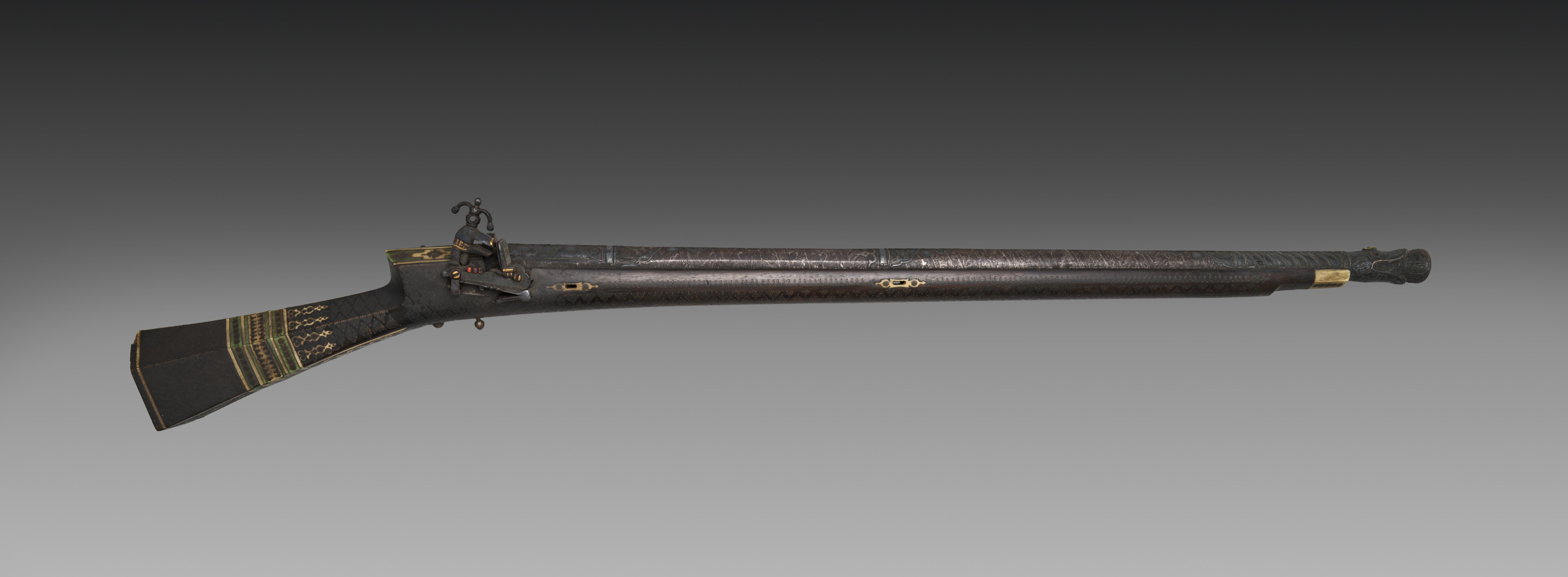The gun, by artist unknown, is a long-barreled firearm with a predominantly dark brown or black color. The stock is made of dark wood with gold inlays near the butt. The barrel and action are made of metal, likely steel, and have a dark finish. There are gold accents and engravings on the gun's surface, including on the stock, barrel, and action. The gun has a flintlock mechanism, indicated by the presence of a cock and frizzen. The butt of the gun is curved and has a distinctive shape. The forearm is long and slender. The gun is set against a gray gradient background that darkens towards the top.