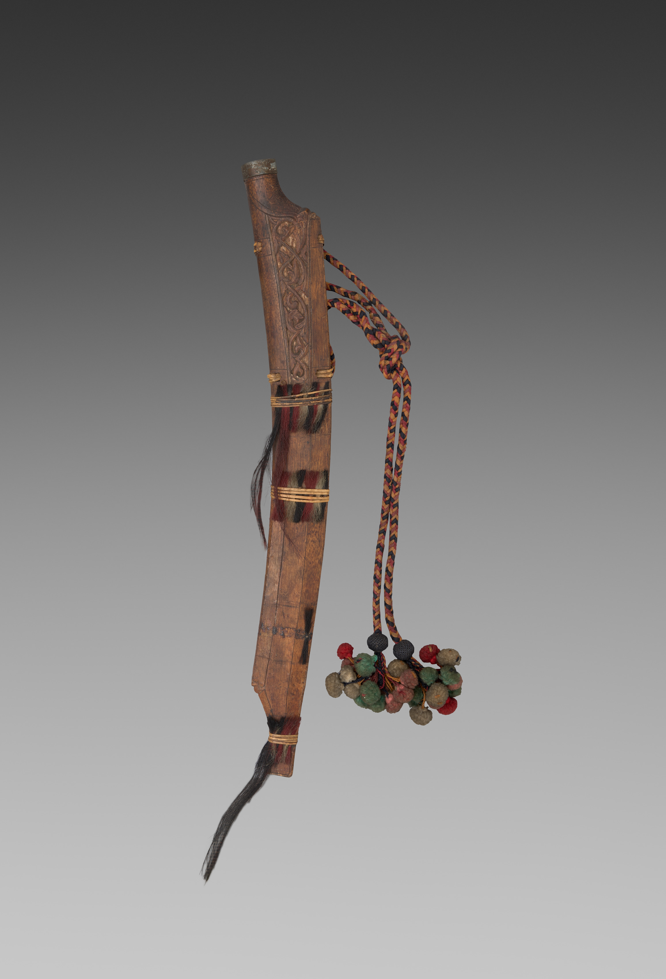 Brown leather scabbard with decorative metalwork and patterned cord, featuring a cluster of beads at the end. The scabbard is long and narrow with rounded top and pointed bottom. It has a black leather thong attached. The cord has orange, blue and black colors. The beads are red, green, brown and black. The background is gray gradient.