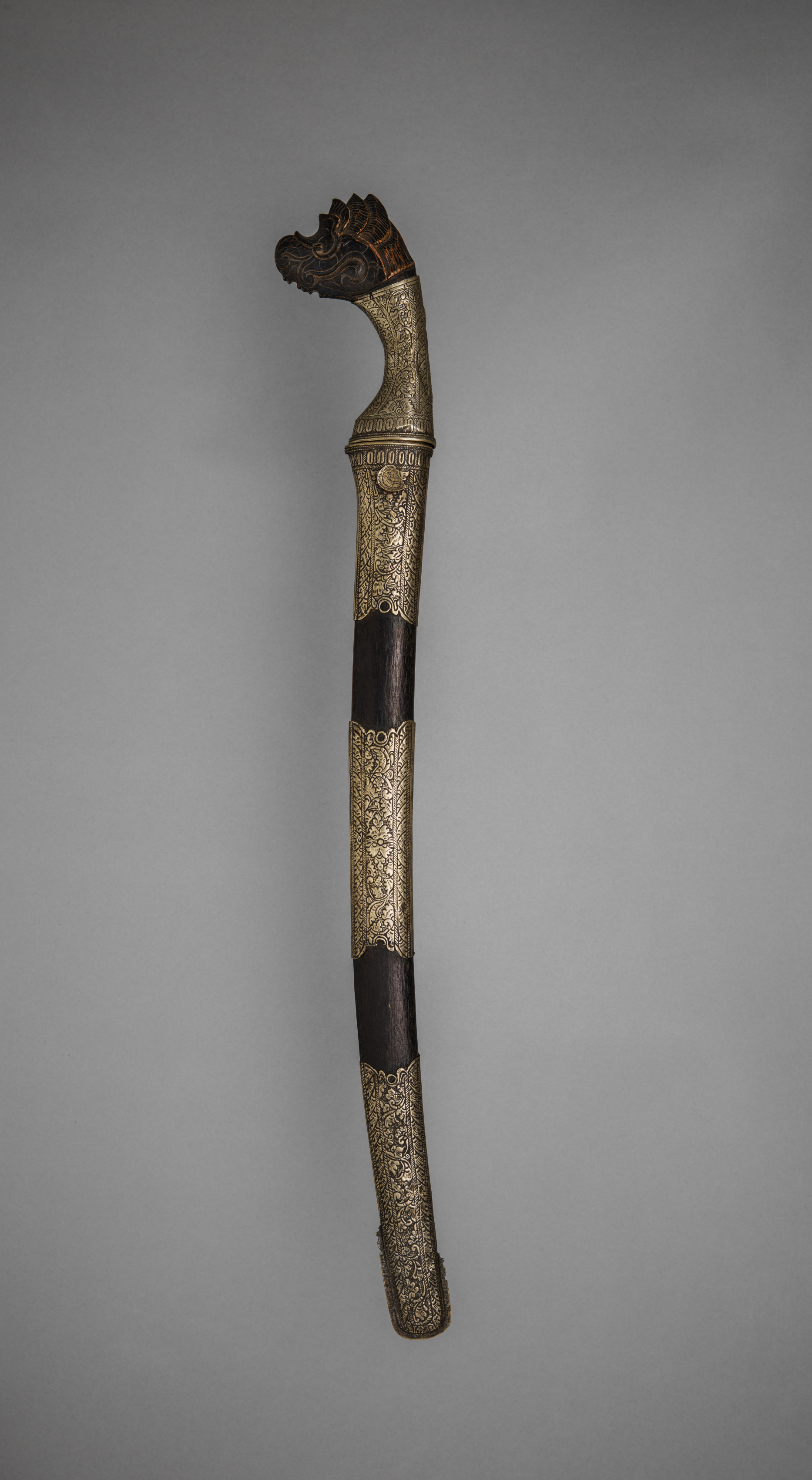 Gold and black sword with ornate designs, handle curved resembling a bird's head. Gold and black patterns on handle.