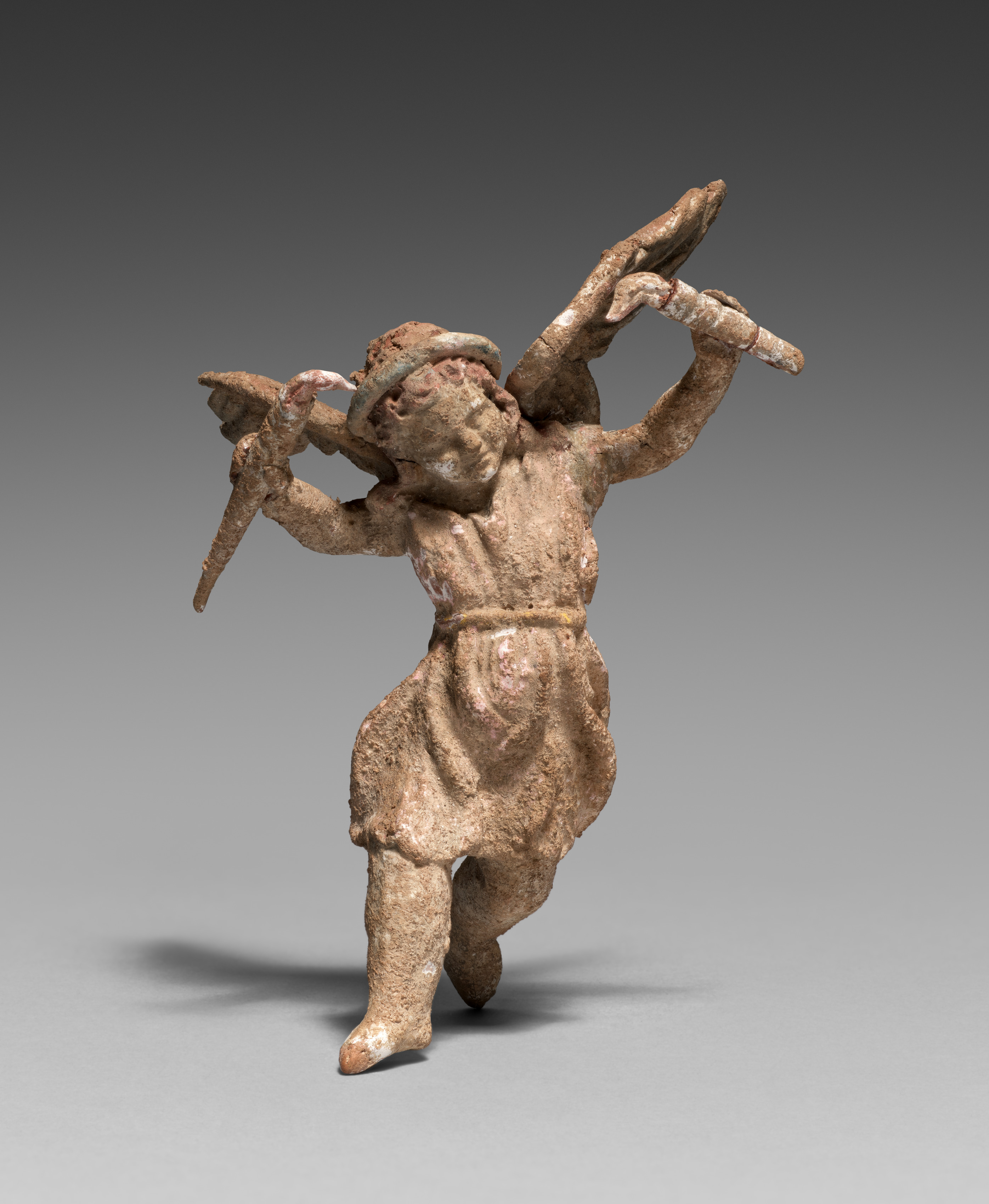 Figurine by unknown artist. Small, beige-colored sculpture of a dancing figure with four arms. The figure is wearing a short skirt and a headband. Two of the arms are bent at the elbow, with hands near the face, while the other two arms are raised above the head, with one hand holding an object. The object resembles a stick or club. The figure has a wide stance, with one leg slightly bent. The background is a gradient from dark gray at the top to light gray at the bottom. A shadow is cast to the left of the figure.
