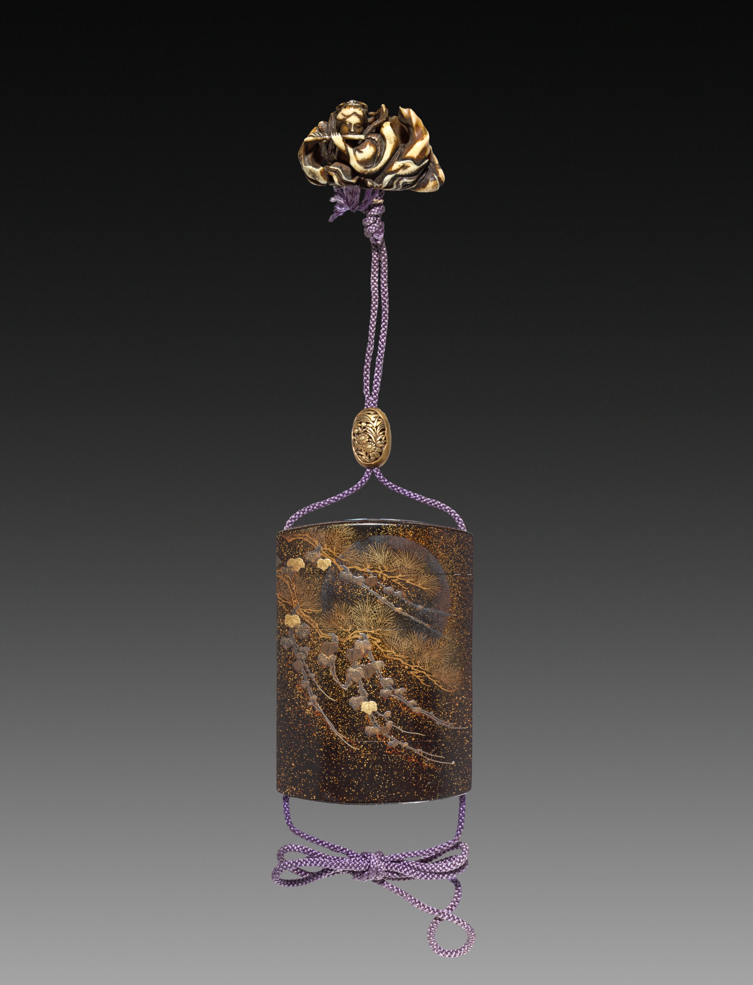 Inro by artist. Rectangular object with rounded edges, predominantly brown with gold accents, featuring a design of pine trees and flowers. Object has a small oval gold piece attached to a purple cord. The cord is tied in a bow at bottom. A gold flower-shaped piece is attached to top of cord. Background fades from black at top to gray at bottom.