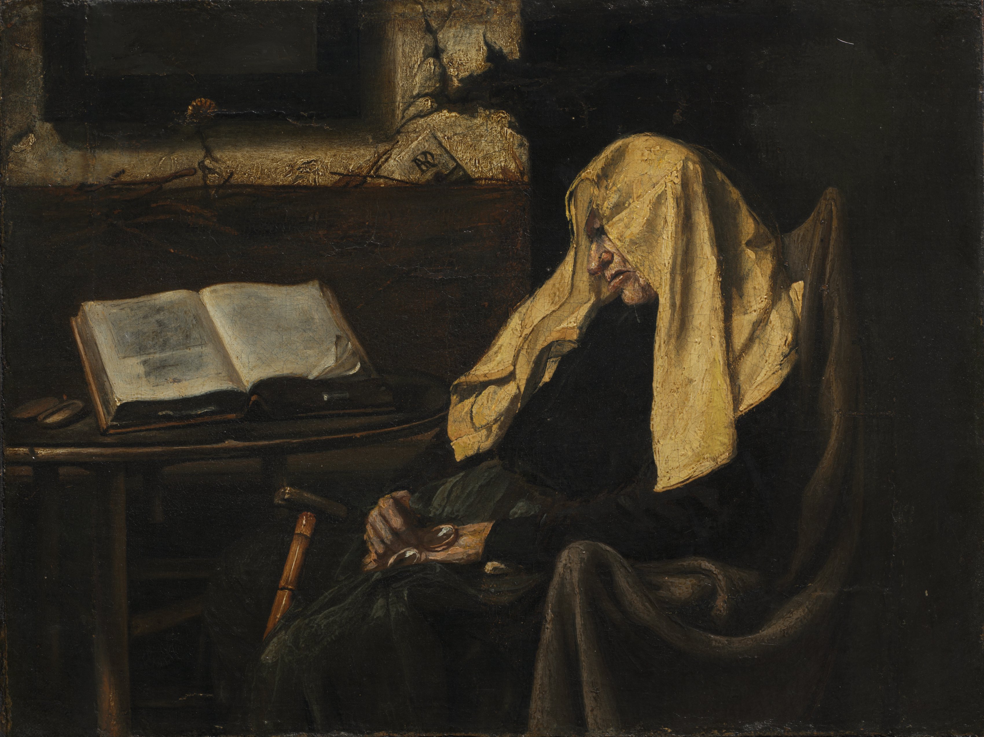 The painting "Old Woman Asleep" by Rembrandt depicts an elderly woman seated in a chair, slumped forward with her head covered by a white cloth. The woman is dressed in dark clothing and has her head resting on her chest as if she is sleeping or has dozed off. She sits in a wooden chair with curved back and armrests, one hand resting on her lap holding an object. To her left is a wooden table with a large open book resting on it. The room's background features a stone wall with a ledge on which some objects are placed. The overall atmosphere of the painting is somber and intimate, with dim lighting casting shadows across the scene. The old woman appears to be alone, lost in slumber in a quiet, possibly indoor setting.